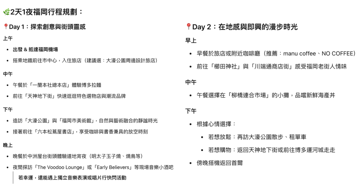 有了目的地,卻還是沒有動力規劃完整旅行?那就交給旅遊規劃師ChatGPT吧!只要輸入期望的旅遊時長以及出發地點,AI便能快速生成出一場最適合你的完整旅遊行程計畫。