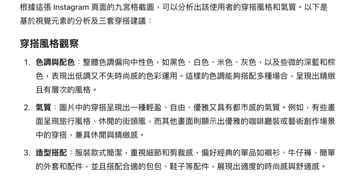 ChatGPT 就會根據你的排版、色彩,去分析個人風格呈現、別人看你會是什麼樣子以及適合的配色的搭配,像 Karina 的 IG 截圖就顯示出整體色調偏向中性色,比如黑白色、米灰色以及些微的深藍和棕色,呈現出一種輕盈、自由、優雅又具有都市感的氣質,例如有些畫面呈現旅行風格、休閒街頭風,其他畫面則顯示出優雅的咖啡廳裝或藝術創作場景中的穿搭,重視細節和剪裁感,偏好經典的單品如襯衫、牛仔褲、簡單的外套和配件。