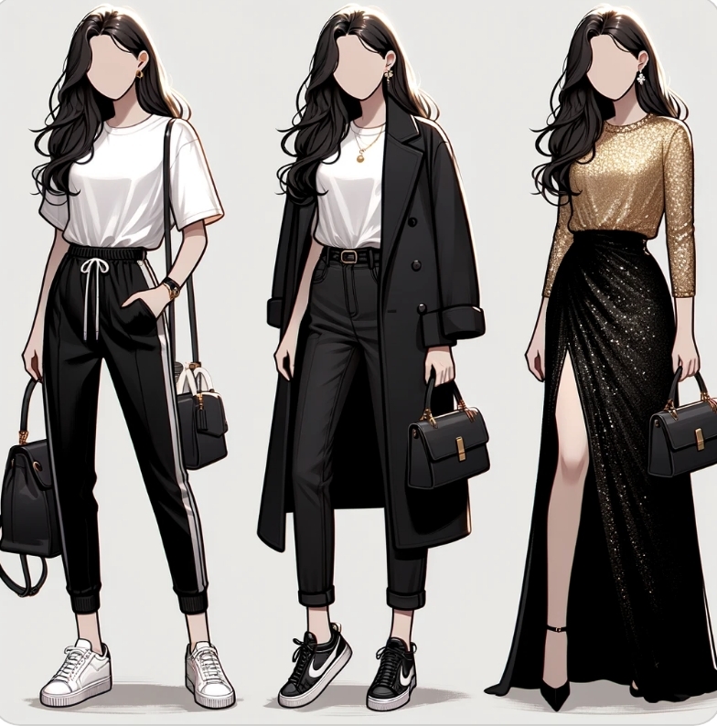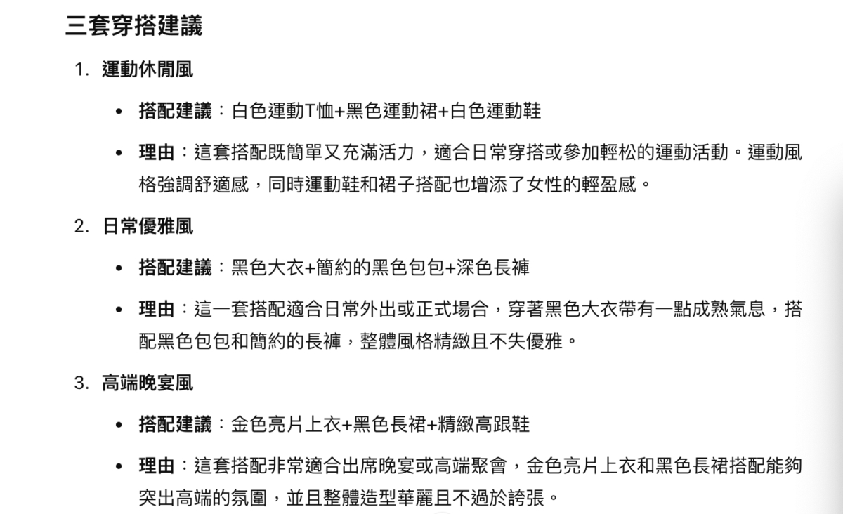 接著同樣分析出 Rosé 適合的三個穿搭風格,這邊的穿搭風格不只是提供建議而已,更會依照「精緻化」內容去打造整體穿搭,像是這次就整理出 Rosé 非常適合簡約的運動休閒風,例如白T、黑裙搭運動鞋的穿搭;另外日常優雅風可以選擇帶有一點成熟氣息的黑色大衣和長褲,整體風格精緻且不失優雅;又或是搶眼造型的高端晚宴風,華麗且不過於誇張。