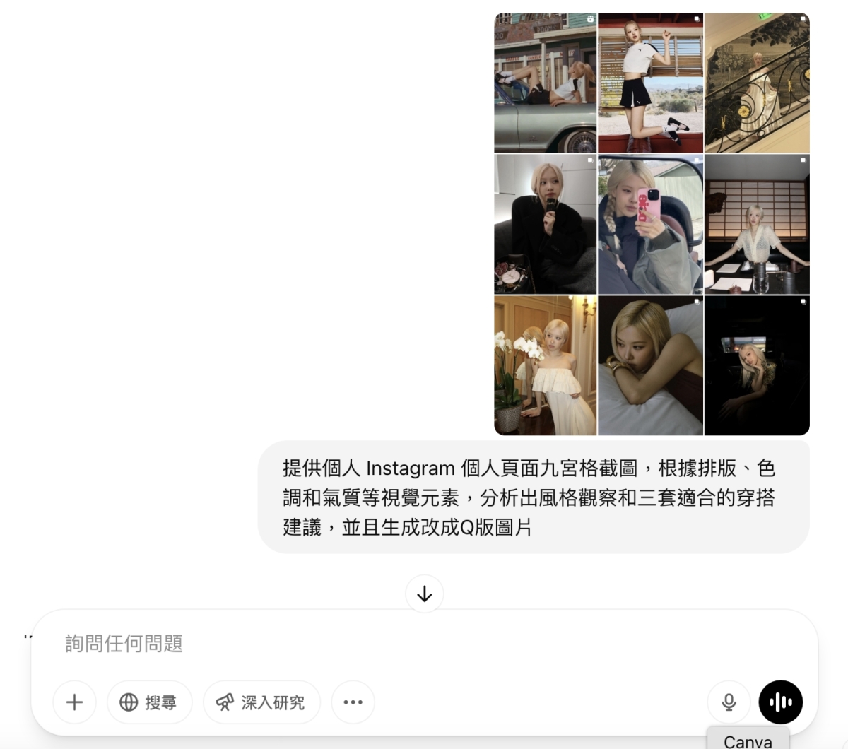 我們先以 aespa Karina 來當示範,可以直接截圖最新或是任意九宮格的頁面圖庫,建議可選擇含有些許日常穿搭、出遊的照片,不一定要有臉部表情,更能準確分析出合適的穿搭風格,接著上傳至 Chat GPT 並寫下指令內容,即可得到以下分析內容。