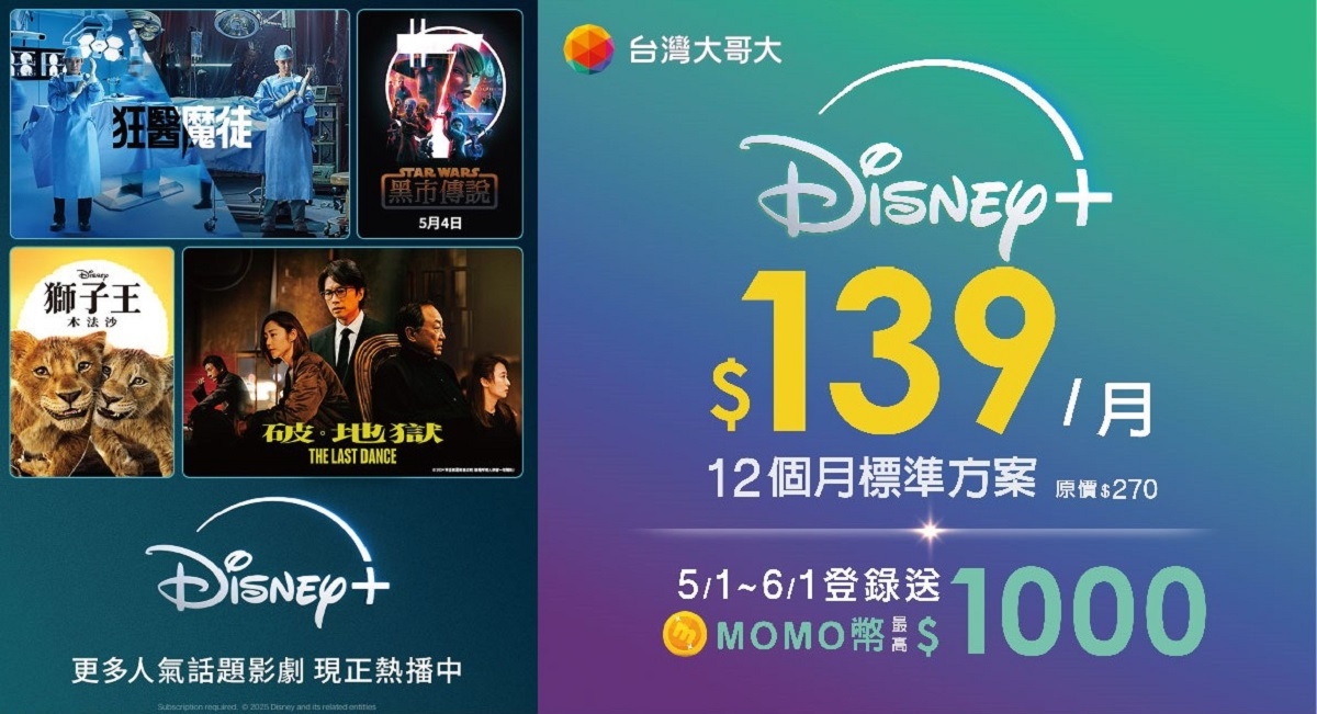 🧡台灣大哥大 Disney+ 限時51折優惠👉6/1前每月139元(原價270元/月),12個月現省$1,572元 ‼️
