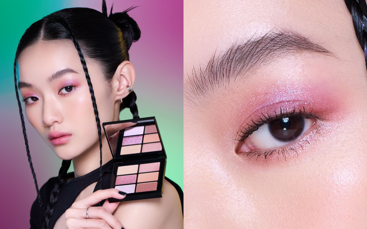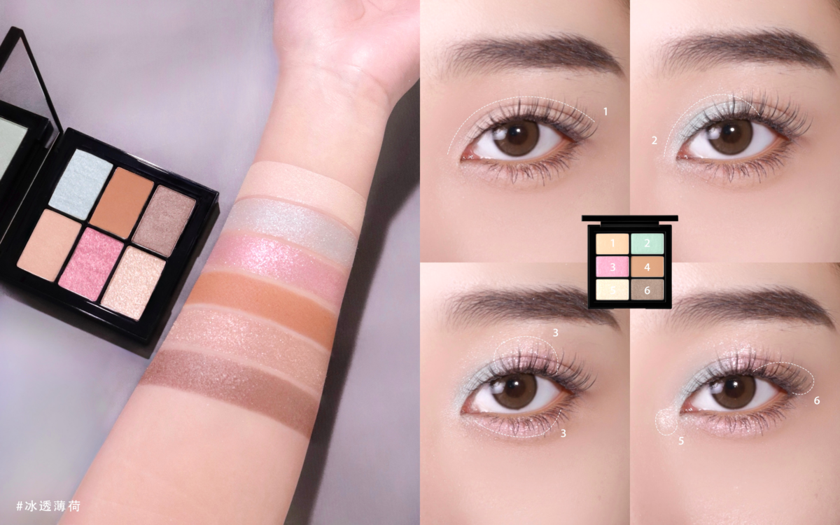 眼妝使用「6色眼影盤 冰透薄荷」撞色漸層打造而成,藉由清透冷冽的薄荷綠與粉紫色幻彩詮釋淺夏感時髦氣息,一抹就讓你登入美妝宇宙,一瞥就成爲恆星焦點!其中 #冰透薄荷 不是可愛的mint,而是「你一開口我就無條件投降」的細閃薄荷,疊上星閃銀粉與冷霧紫調,打造出彷彿從元宇宙走出來的3D感眼妝,光澤神秘得像月球背面的祕境,卻又親膚得讓人無法自拔!