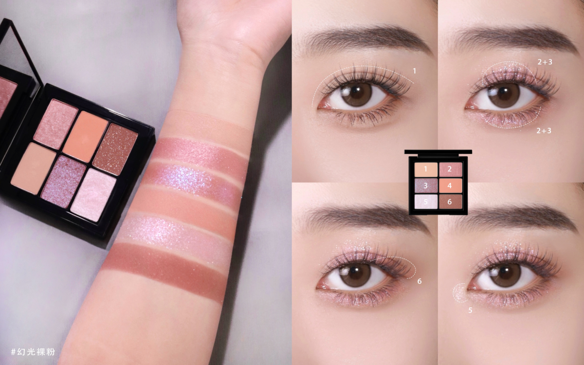 「極光裸粉」妝容是以「6色眼影盤 幻光裸粉」未來感燦光裸粉色,打造如極光般流轉的立體眼眸,眼窩上的細緻幻光如同浩瀚銀河般閃閃發光,每一瞥都是一眼萬年的深邃光輝!認真說,市面上裸粉色很多,但#幻光裸粉 完全顛覆你對粉色的想像!它不是保守無廢色的安全牌,而是閃得剛剛好、仙得剛剛好的濾鏡等級粉色盤!