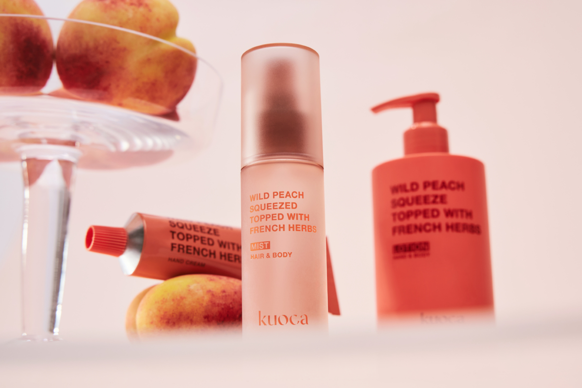 韓國人氣香氛品牌Kuoca經典爆款的香氣「野桃 WILD PEACH」是品牌銷售第一的香氣,因應春夏季需求,品牌首度推出水潤噴霧,水感質地搭配細緻柔和的噴霧設計,