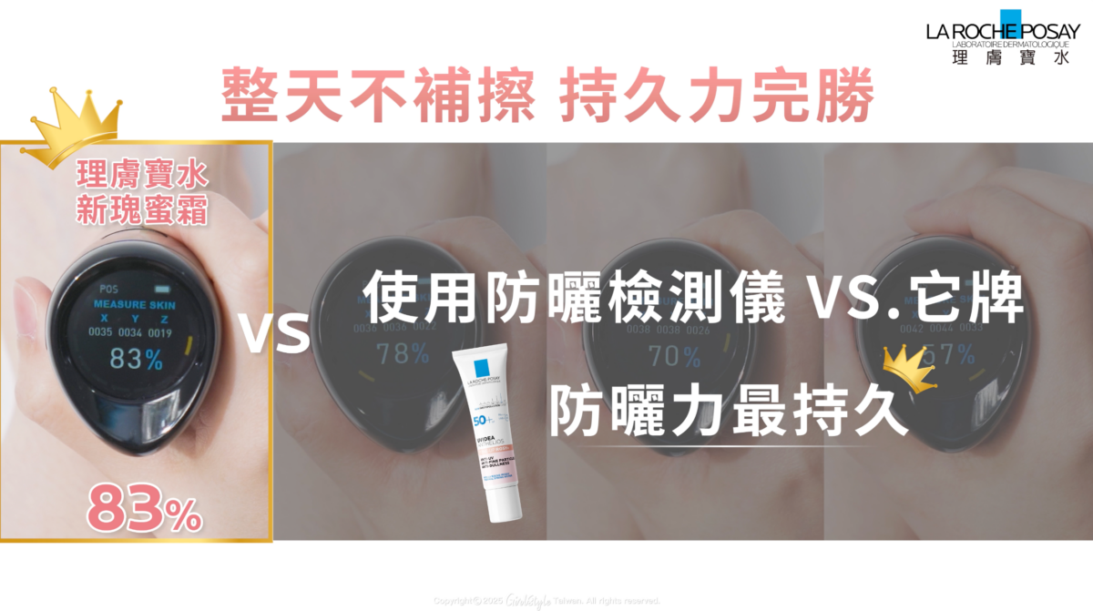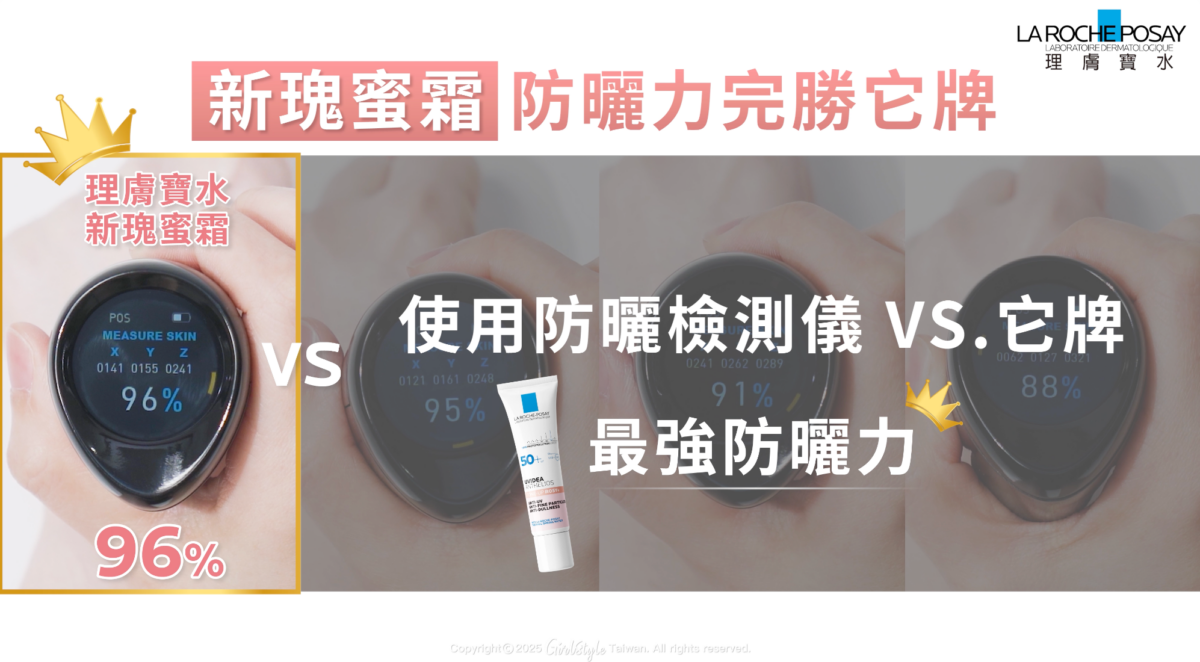 小編實測組特地分別挑選了台灣醫美、日系美妝、專櫃大牌三個不同品牌的隔離防曬與理膚寶水「新瑰蜜霜」進行防曬力實測!從早上分別進行塗抹並待成膜後,使用專業防曬力儀器檢測,剛塗上的防曬力大家表現都很不錯,其中以理膚寶水的「新瑰蜜霜」防曬力高達96%最強!而他牌初步防曬力分別是台灣醫美88%、日系美妝91%、專櫃大牌95%。