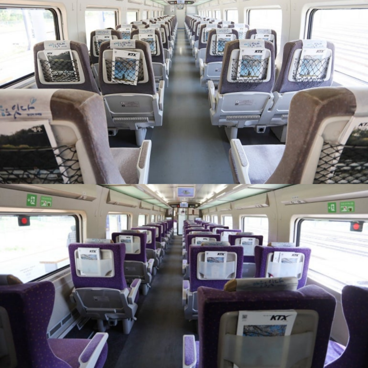 KTX列車內部乾淨整潔,座椅配置與飛機相似,大多為2+2排列,有些特等席為2+1設計。