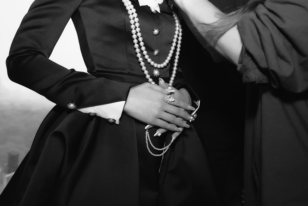 美甲設計更是精緻迷人,以經典的法式美甲為基礎,倒V的微笑線讓整體更加俐落帥氣,也呼應了Jennie的褲裝造型,加上香奈兒標誌性的立體山茶花搭配珍珠鍊條細節,完美展現出法式浪漫及優雅。
