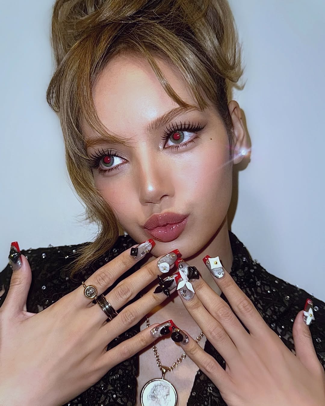 首次出席 Met Gala 的 Lisa 以Louis Vuitton透膚蕾絲造型的西裝外套搭配無褲造型,性感爆表!而由Juan Alver為Lisa所設計的LV老花美甲也悄悄的成為亮點。