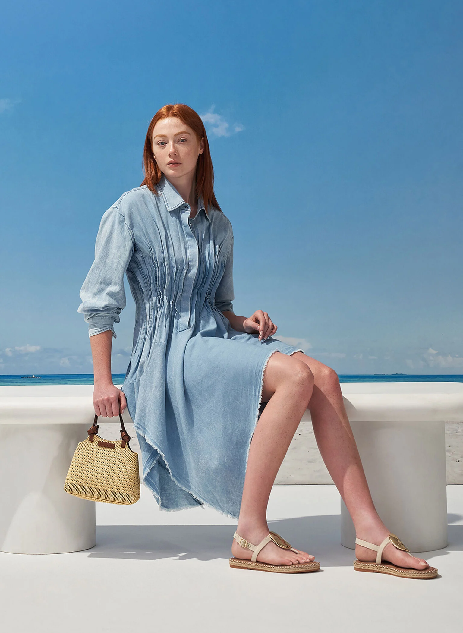 經典 Sianna 托特包同樣以柔韌帆布與溫潤棕色小牛皮拼接,充滿夏日感的帆布材質時髦亮眼,柔軟寬敞的包身提供充足的收納空間,無論奔赴工作或漫步街頭都隨性自在,採肩背方式呈現,大包還是依舊很流行的廓形!