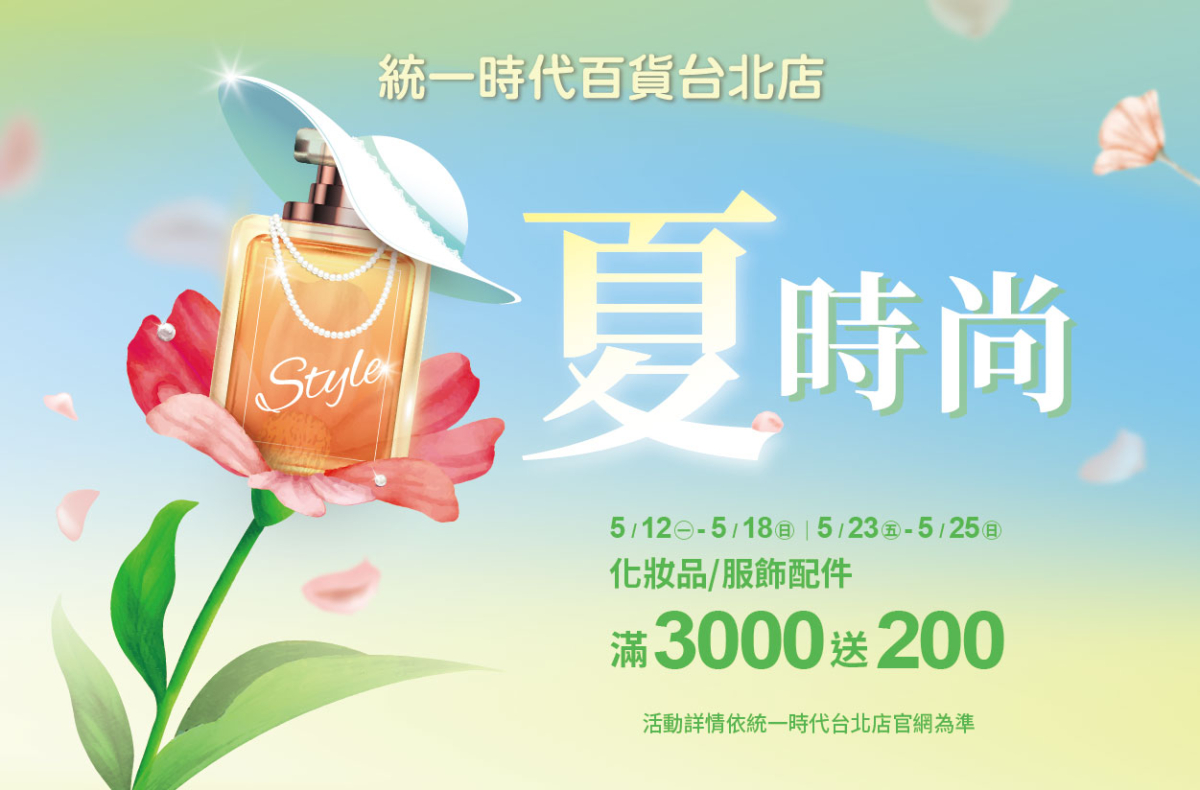 統一時代百貨台北店5/12-5/28夏時尚檔期登場,活動期間5/12-5/18及5/23-5/25化妝品、服飾配件指定櫃位滿3000送200活動,搭配統一時代聯名卡刷滿3000送100,最高滿3000送300,瞄準夏日職場穿搭的服飾需求,換季買衣服入手趁現在!