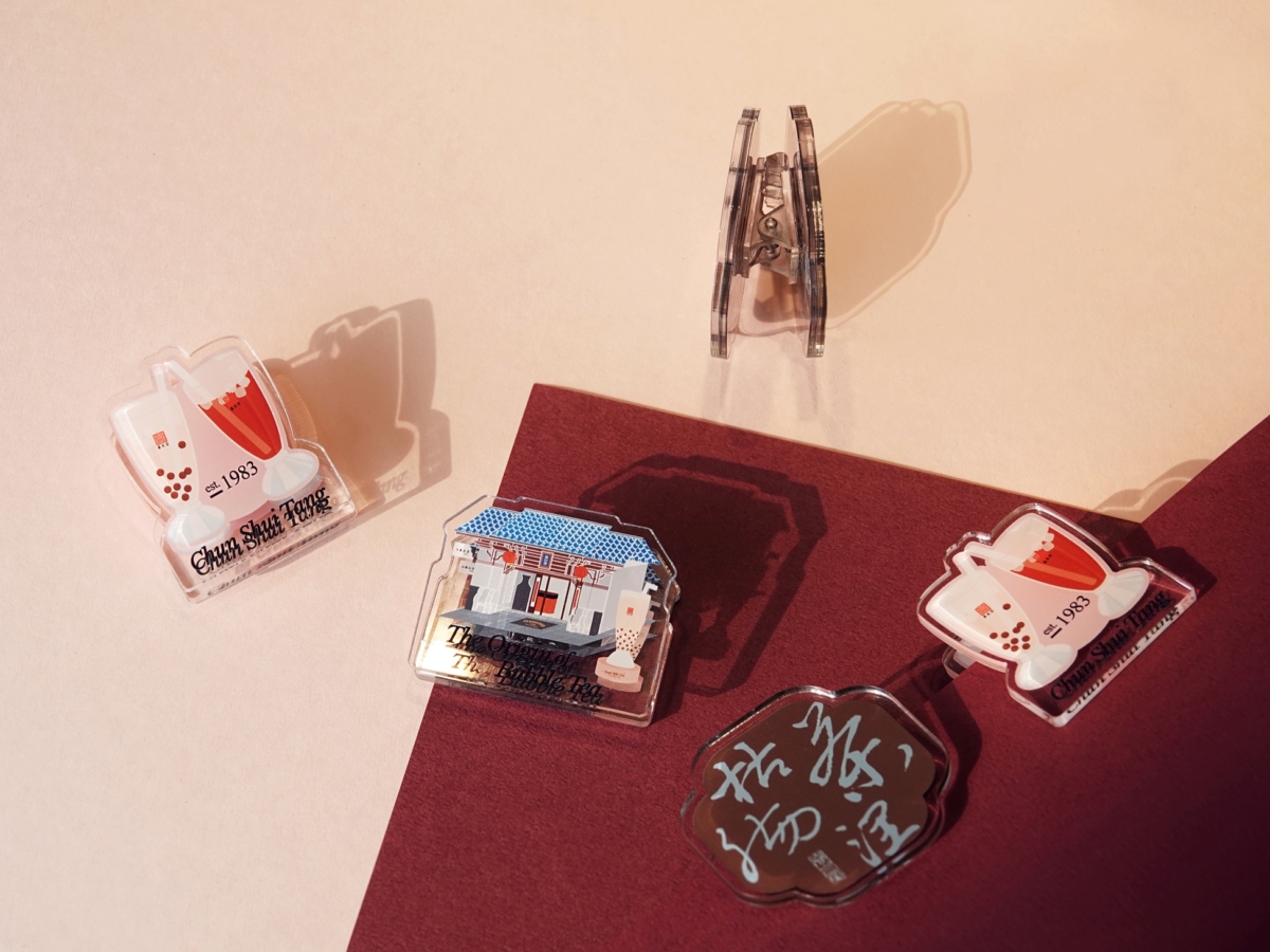 其中一般人較不熟悉的「墨寶款」磁鐵夾,其實與春水堂息息相關!夾子上印製的「茶潤枯腸」正是春水堂外帶杯膜上的書法字,也是春水堂創辦人劉漢介先生的墨寶。意思是喝茶不只解渴,更是一種心靈滋養,當心思乾涸、靈感枯竭之時,好茶就像春雨潤物,滋養你的身心。「珍奶款」則是用春水堂發明、最經典的珍珠奶茶和泡沫紅茶乾杯!「創始店款」圖案是世界上第一間春水堂,創立於1983年,極有早期茶館氛圍。