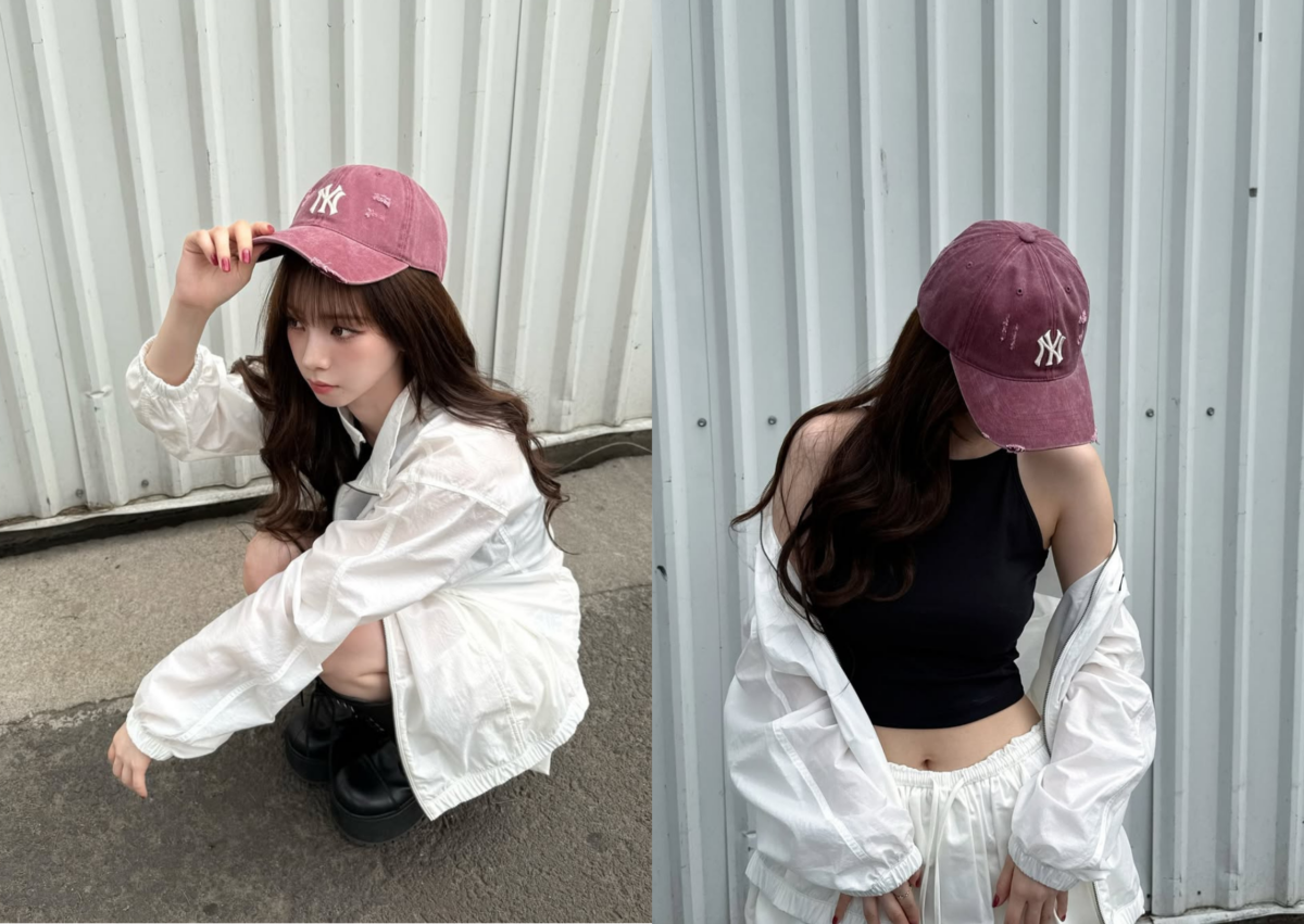 Karina 也在 IG 上曬出最新示範的棒球帽穿搭,身穿 MLB 白色防風抽繩外套、澎澎裙和黑色短版上衣,搭配一頂煙粉色復古水洗刷舊洋基隊棒球帽,保留了 MLB 標誌性的棒球帽剪裁和品牌刺繡,加入了低調粉色調,散發出甜美又帶點酷感的氛圍。