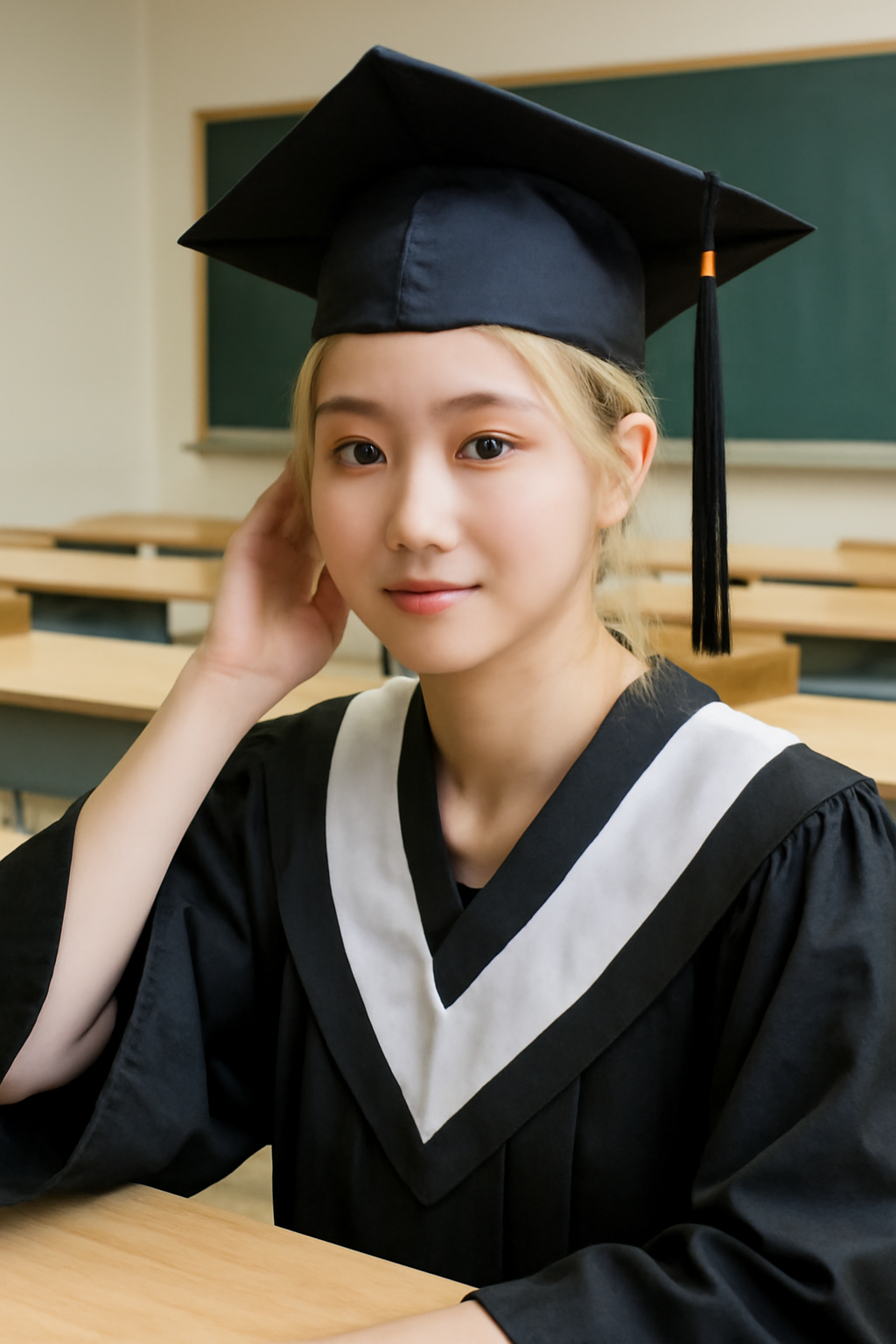 學士帽本身會壓住頭頂,建議出門前用電棒稍微抓出蓬鬆感或立體線條,不然整顆頭會看起來又圓又大,拿下帽子時也容易看起來沒有精神。