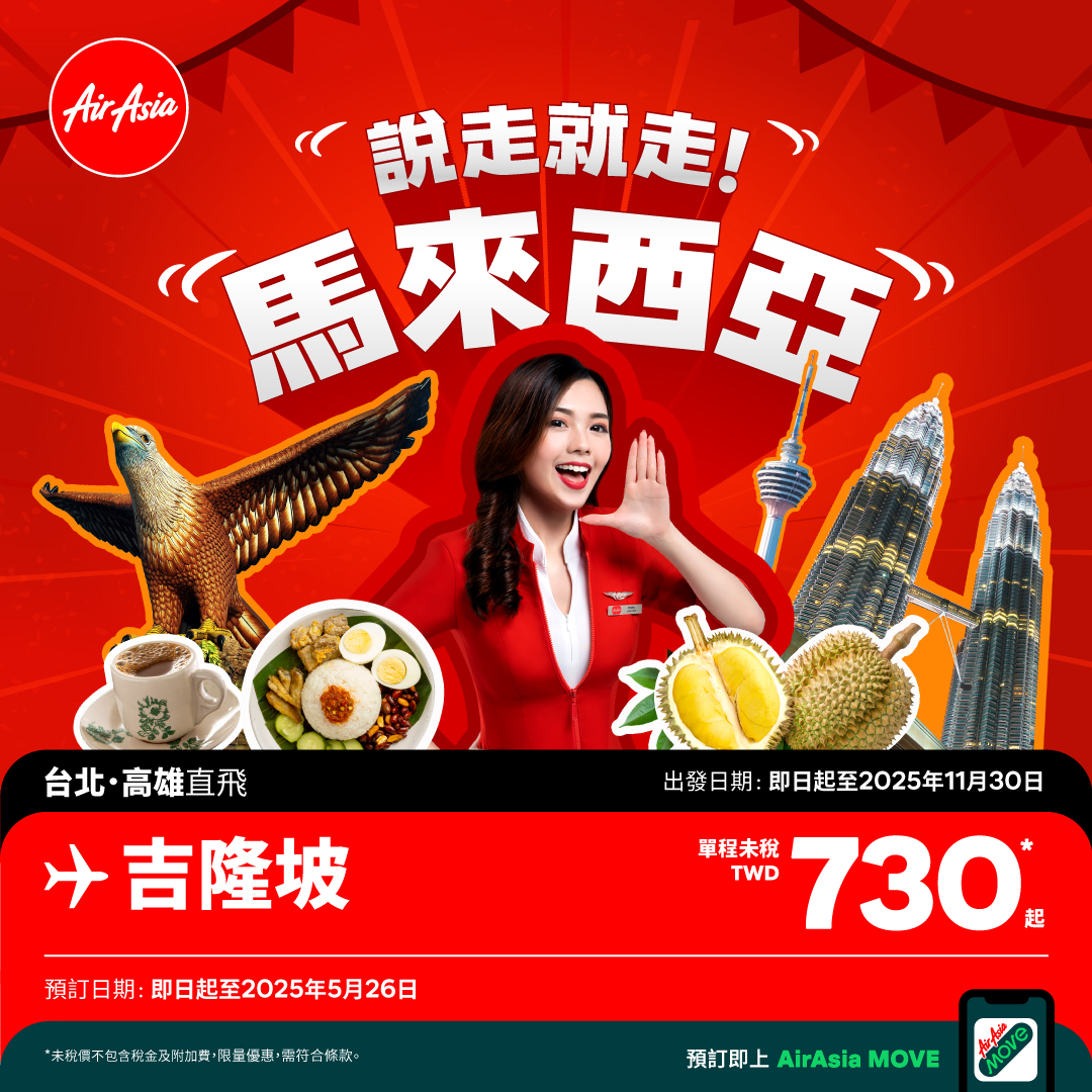 為慶賀旅遊節目《飛吧!玩客 Let's Go Flying》正式開播,AirAsia驚喜推出台北/高雄飛往吉隆坡的限時特惠機票,單程未稅只要730元起!優惠適用出發日期為即日起至2025年11月30日,讓您輕鬆用超值價格說走就走,飛向馬來西亞展開冒險。