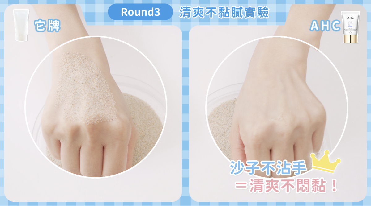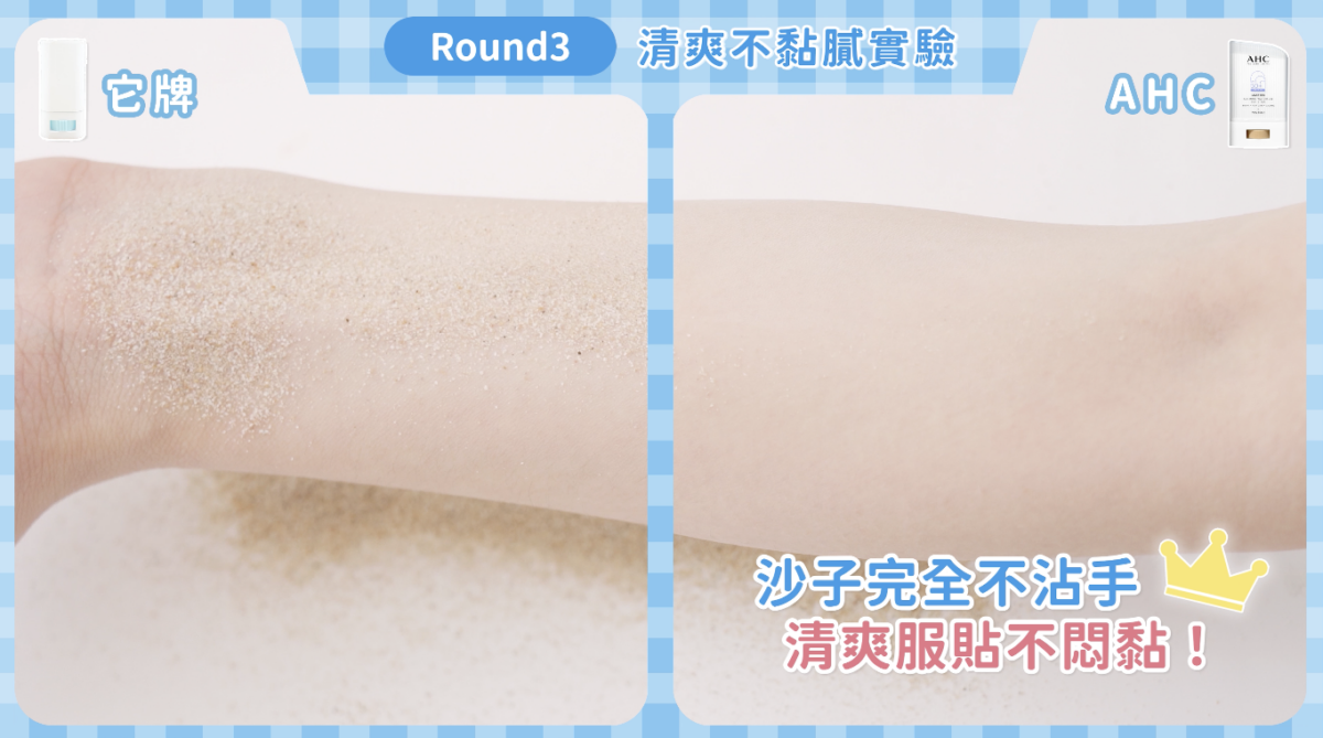 - Round 3|清爽不黏膩實驗:在擦上他牌與AHC小白傘防曬棒的手臂均勻撒上沙子,前半部塗抹他牌的防曬,明顯沾黏沙子,後半部塗抹AHC處幾乎無沾黏沙子!實驗證實AHC小白傘防曬棒在清爽不黏膩這塊也相當優秀!