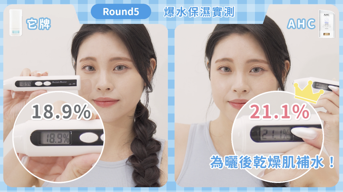 - Round 5|爆水保濕實測:在妝前左右臉分別擦上他牌與AHC小白傘防曬棒,透過保濕儀測驗補水數值,右臉擦上AHC明顯與左臉他牌對比多了3%保濕度!實際證實使用後水分值上升,防曬同時爆水保濕、水潤不乾燥!
