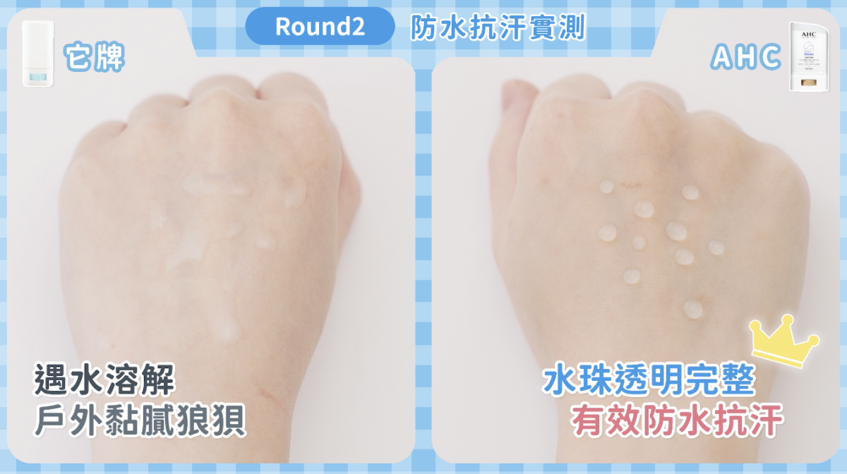 - Round 2|防水抗汗實測:各別擦上他牌防曬與AHC小白傘防曬棒後,都滴上水珠測試防水抗汗力,結果右手背的水珠明顯完整不泛白、不滑落,左手背的他牌則明顯融水泛白、水珠快速滑落;像較之下AHC的防曬棒防水效果更驚艷!