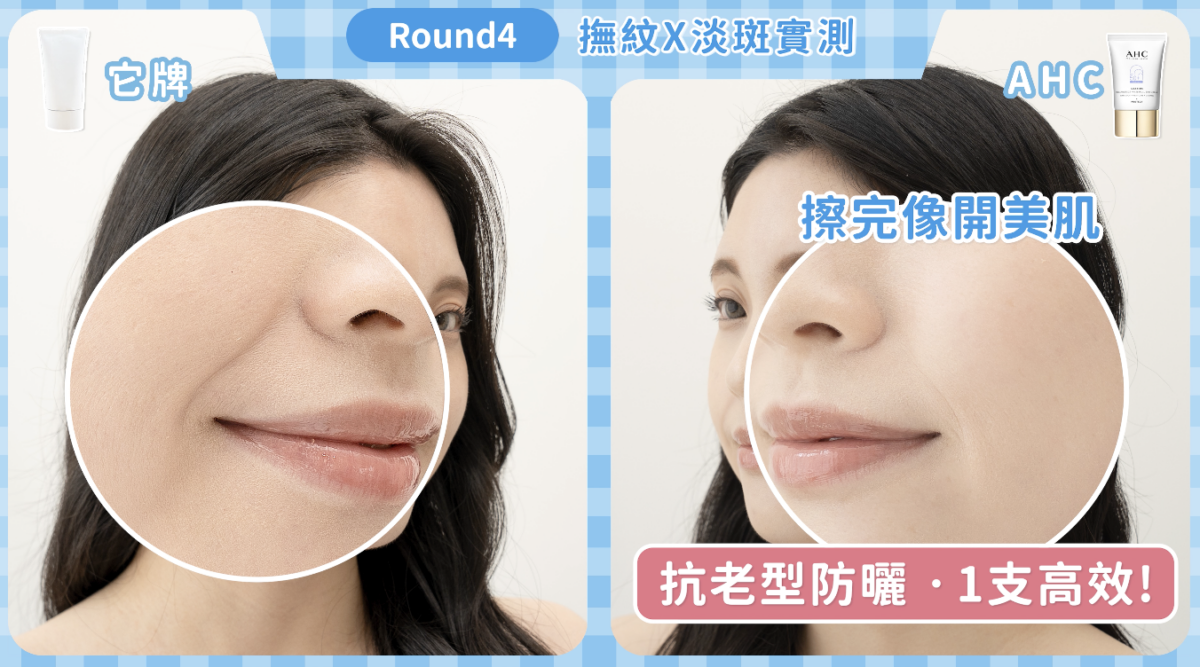 - Round 4|撫紋X淡斑實測:在左臉擦上他牌防曬,右臉則為AHC小白傘防曬乳,連續實驗數天後,右臉更為撫紋澎亮,左臉則是法令紋跑出來見人(羞)!明顯看出AHC更能超越防曬!同時達到抗老、提亮效果!