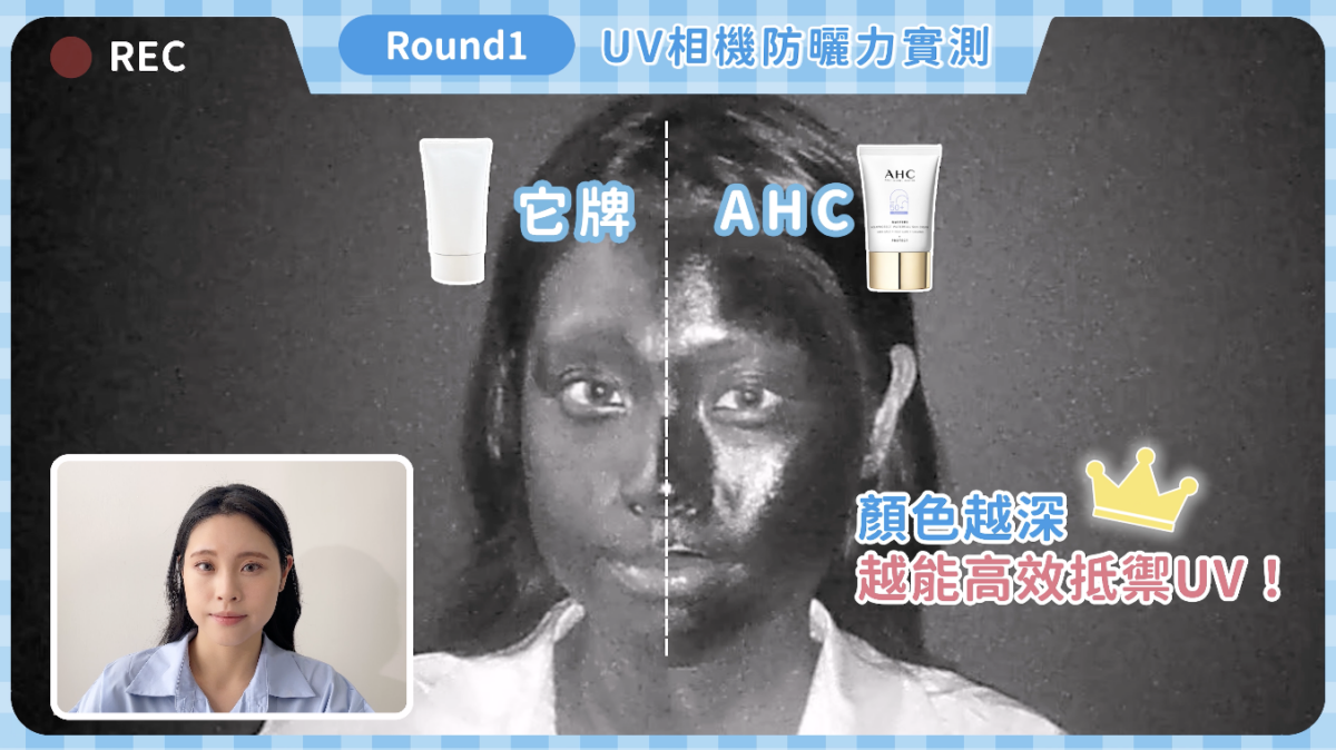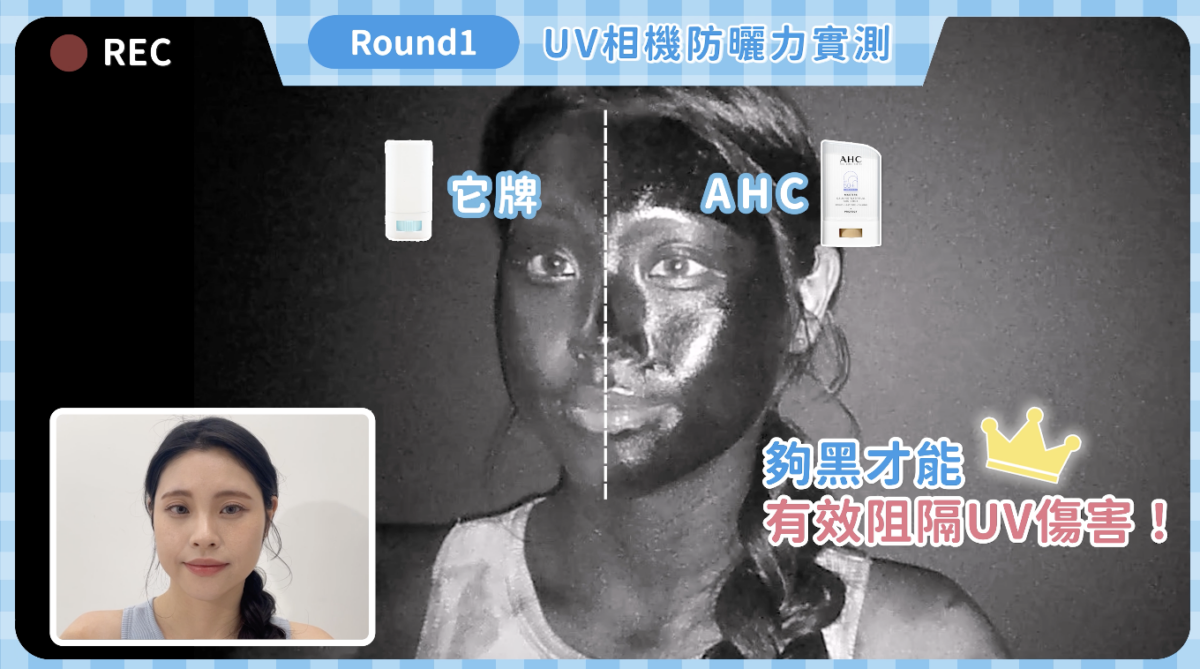 - Round 1|UV相機防曬力實測:在輕抹一層他牌與AHC小白傘防曬棒後,明顯透過UV相機看到右半部的顏色更深黑(*越黑表示防曬效果佳),代表AHC遮蔽UV的效果更明顯!相較他牌效果確實差強人意~