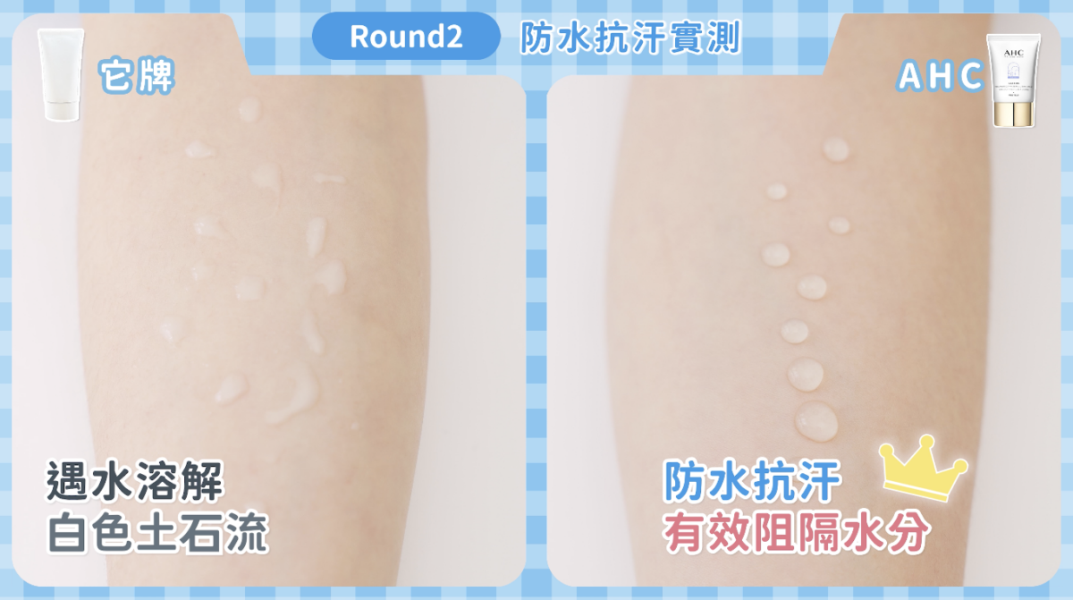 - Round 2|防水抗汗實測:擦上他牌防曬與AHC小白傘防曬乳後,各別都滴上水珠測試防水抗汗力,結果右手臂的水珠明顯完整不泛白、不滑落,左手臂的他牌則已明顯融妝泛白、水珠無法聚焦;像較之下AHC明顯防水、抗汗效果持久有效!
