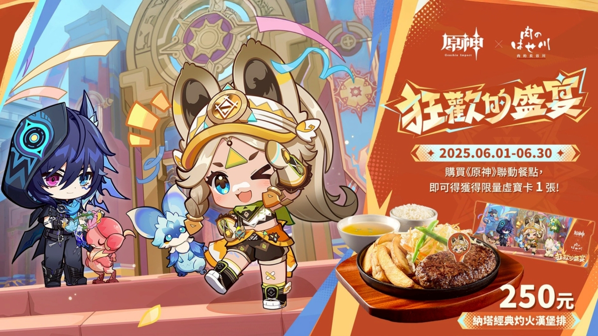 今夏最令人期待的夢幻聯動來了!人氣日式漢堡排專門店 「肉的長谷川」攜手全球熱門遊戲《原神》展開盛大合作,聯名主題為《狂歡的盛宴》,將於 2025年6月1日至6月30日 強勢登場,推出四款結合遊戲元素的聯名特色套餐,為玩家與饕客帶來視覺與味覺的雙重饗宴!