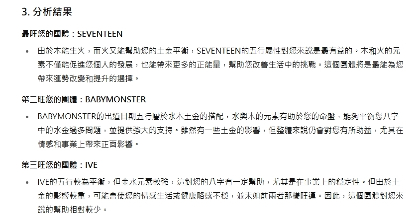 ▼在chatGPT輸入追星指令資料後,就會直接分析出最適合你命格的追星團體