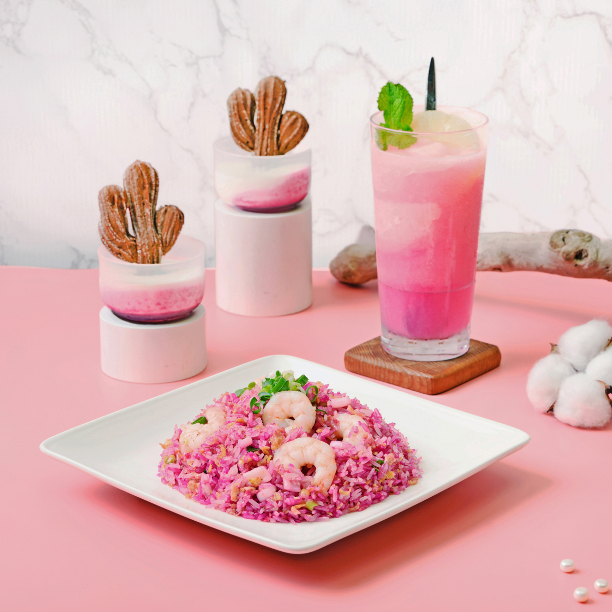 首先登場的是創意主餐「海派花火炒飯」,師傅特別選用仙人掌汁為米飯染上粉嫩色澤,炒飯中更加入鮮甜魚卵、彈牙蝦仁與小卷等海味食材,口感豐富、滋味鮮美,簡直就是將整場花火節搬進味蕾中。清爽解膩的「粉紅果漾」飲品,巧妙融合仙人掌原汁與鳳梨、水梨、蔓越莓等多層次果香酸甜,頂端再以鳳梨片與薄荷葉精緻點綴,不僅沁涼消暑,更讓人忍不住拿起手機打卡留念,粉嫩色調與熱帶風情絕對是今夏最上鏡的夢幻系飲品。甜點「掌心朵朵」則將閃電泡芙的內餡與外殼創意重構,於甜點杯中種出一顆可愛的「小仙人掌」,底層選用Cream cheese,搭配酸甜仙人掌原汁,酸中帶甜、層次豐富,超萌造型使人少女心爆棚,週年慶期間,精緻討喜的粉紅果漾+掌心朵朵套餐價只要199元,快帶家人好友一塊嚐鮮。