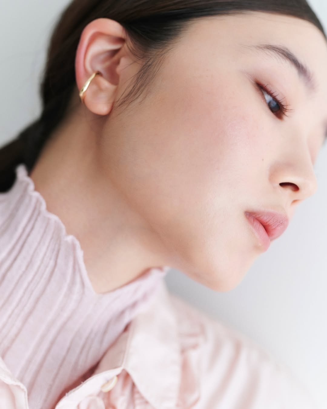 將腮紅色調延伸至唇妝,讓整體妝容更具一致性與柔和感,唇部建議先以裸粉色系唇線筆從唇中向外暈染打底,打造自然血色感,接著再疊擦一層帶有光澤感的唇膏或唇油,不僅提升妝感的水潤透明度,也讓雙唇呈現出如果凍般輕盈的立體感。