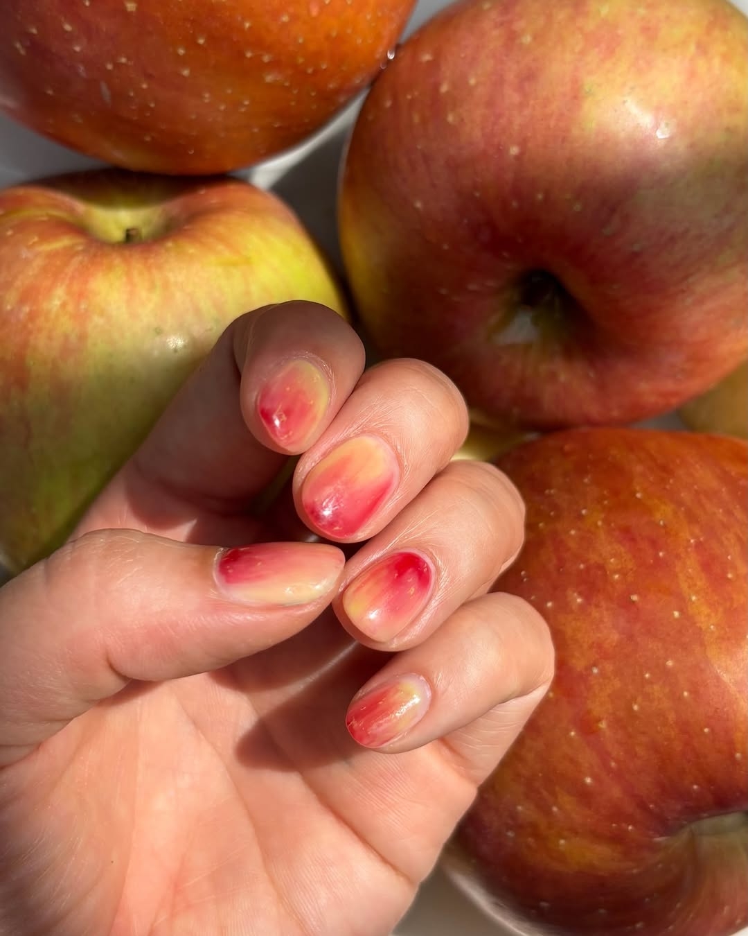蘋果的美甲的靈感來自飽滿多汁的蘋果外皮,完美捕捉了果皮隨著時間推移的顏色變化,而且還帶有細膩的漸層效果,宛如熟透的蘋果在陽光下微微閃爍的色澤。