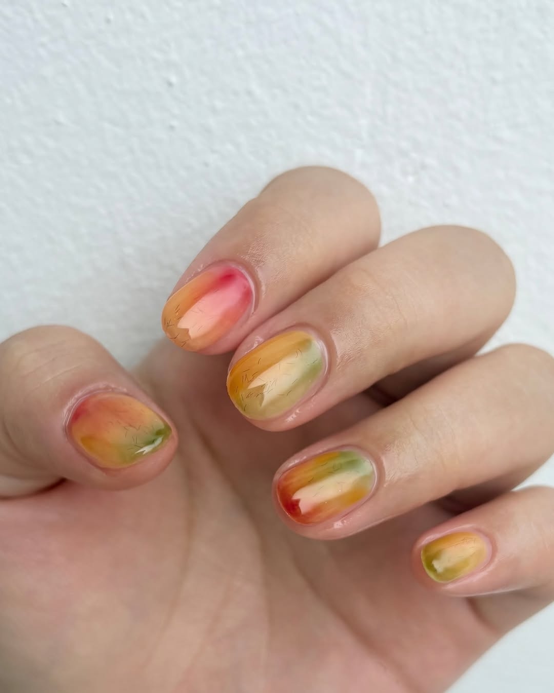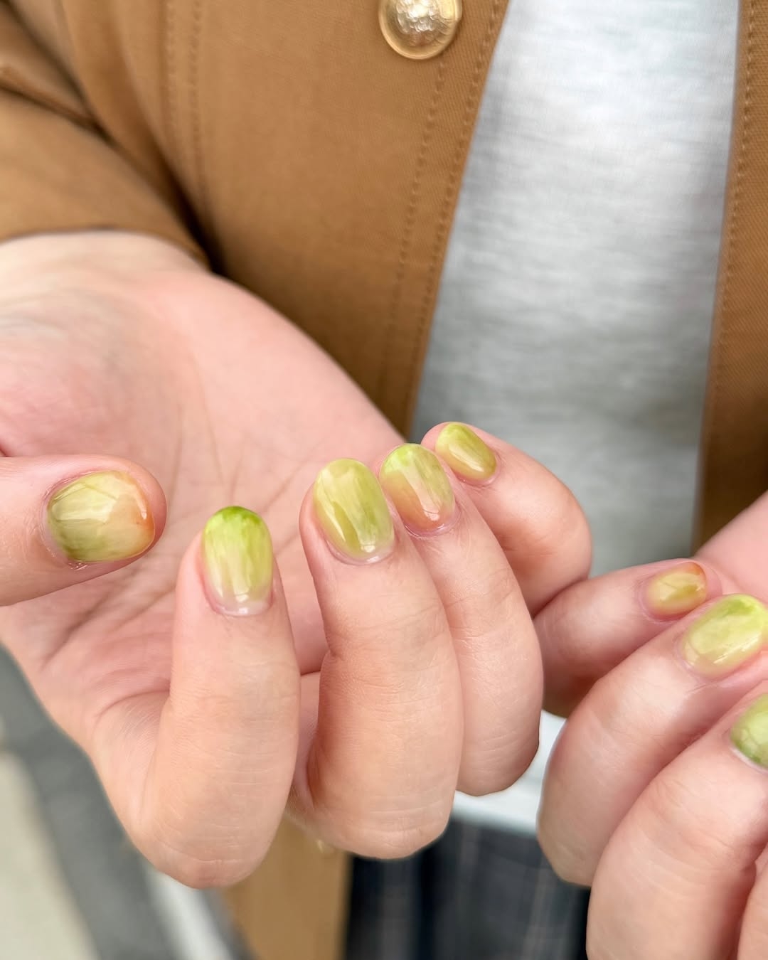 梅子美甲最具特色的就是它的不規則暈染效果,這樣的設計模擬了梅子果皮的斑駁與自然瑕疵,選用漸層暈染效果,讓色彩更加柔和且富有層次感,而青綠與橘黃的搭配,看似不和諧的兩種色彩,竟然也能碰撞出具有藝術感的效果。