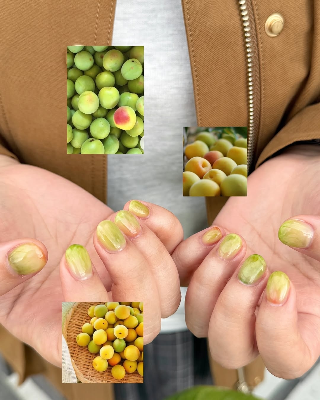 梅子美甲的靈感來自於不同梅子的色澤變化,從深綠、青綠到鮮豔的黃色,這些深淺不一的果皮色彩仿佛將整個自然界的色彩濃縮在指尖!