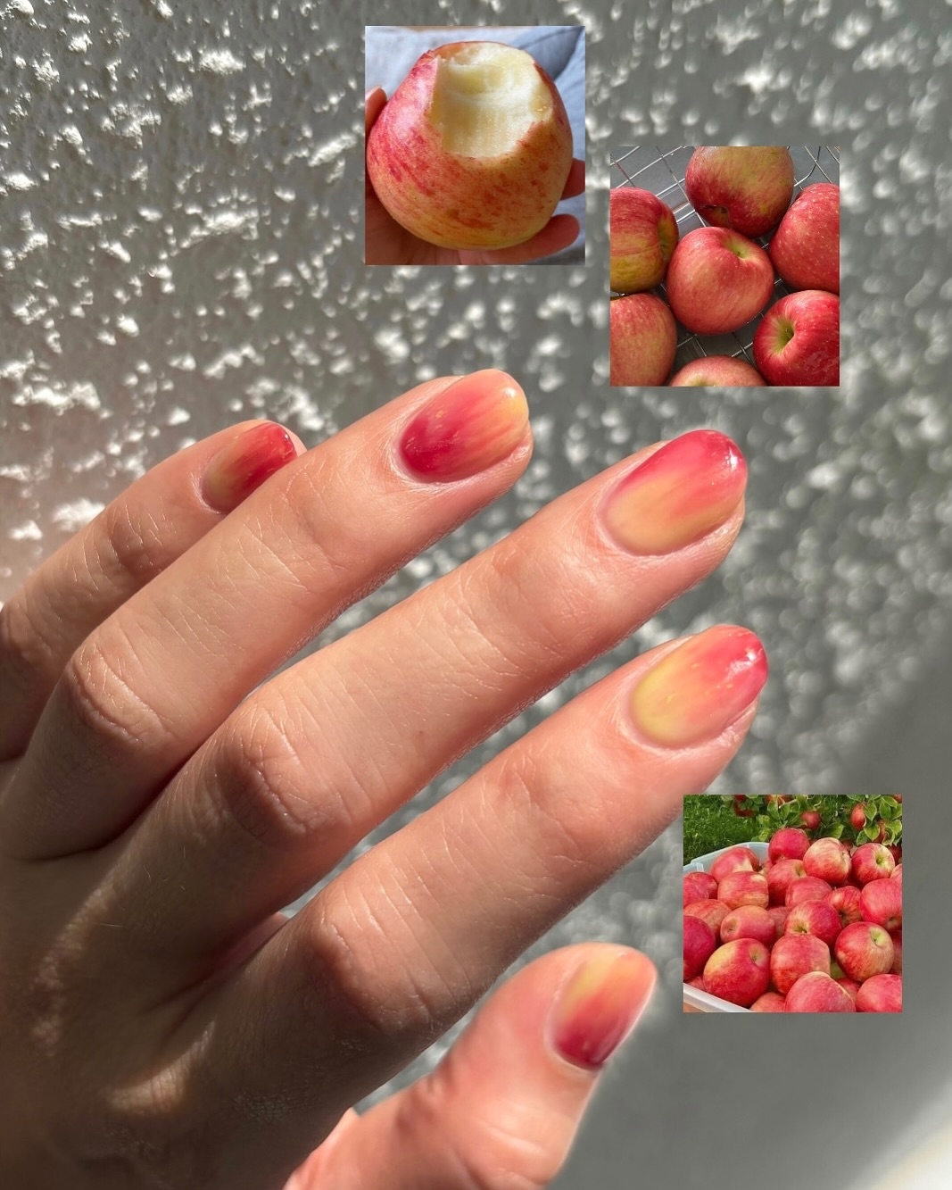 底色由淡黃至橙紅的過渡,不僅呈現出蘋果的多層次色彩,還能模擬出果皮邊緣的自然斑駁感,這種自然的不均勻暈染,讓指尖像是蘋果樹下的天然作品,透露出自然的質樸和不加修飾的美感。