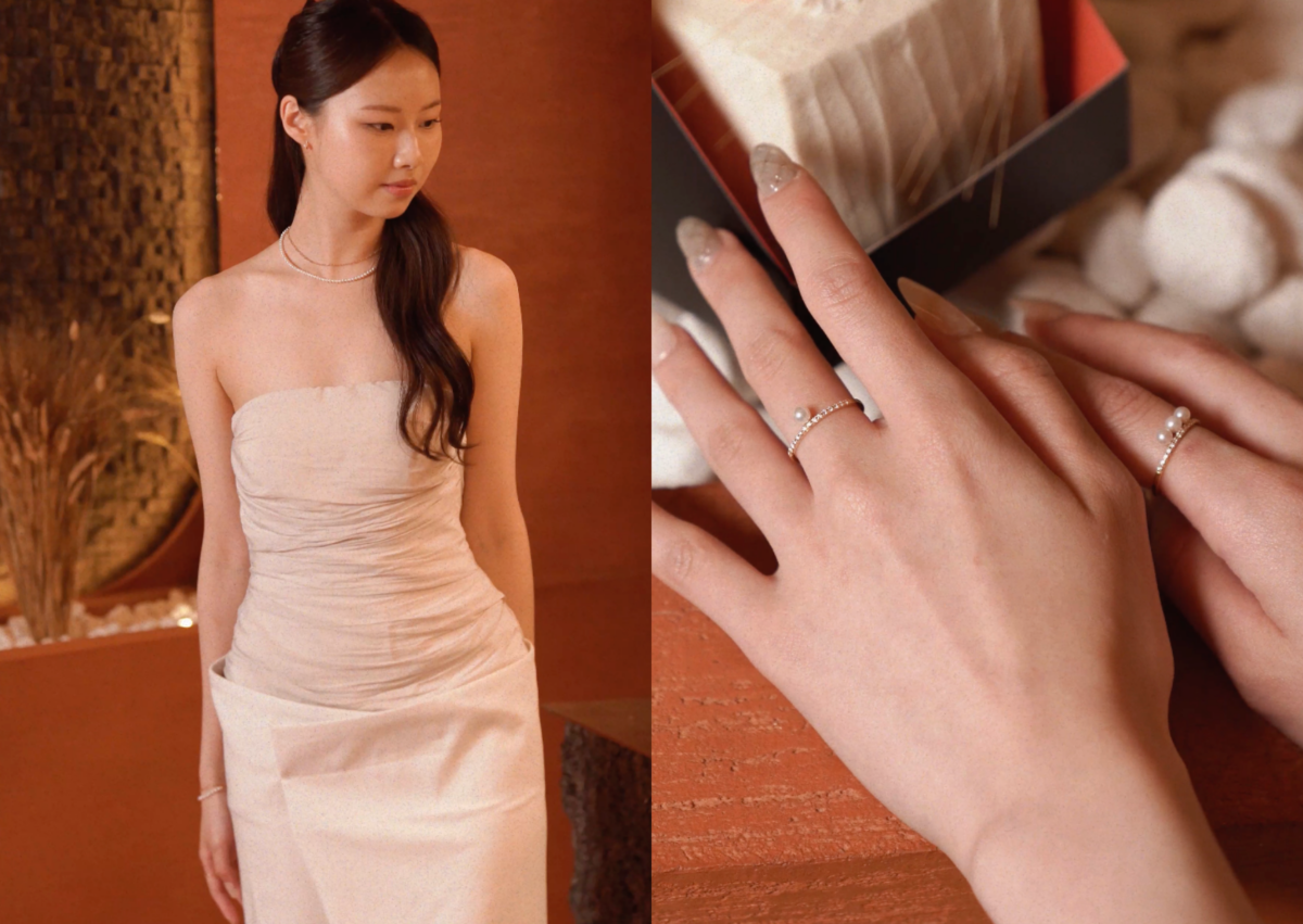 來自日本首席輕珠寶的品牌 STAR JEWELRY,創立於 1946 年橫濱,以卓越的工藝和歷久彌新的設計聞名,還是日劇女星的御用珠寶呢。這次配戴的是 K18 及 K10 黃 K 金戒指、耳扣、耳夾、手鍊和項鍊,分別鑲有不同顆數的 Akoya Pearl 珍珠,呈現特別細緻且優雅的氛圍。