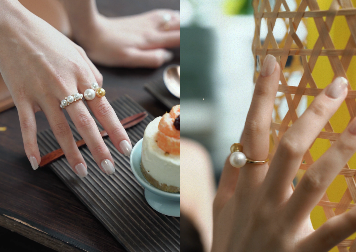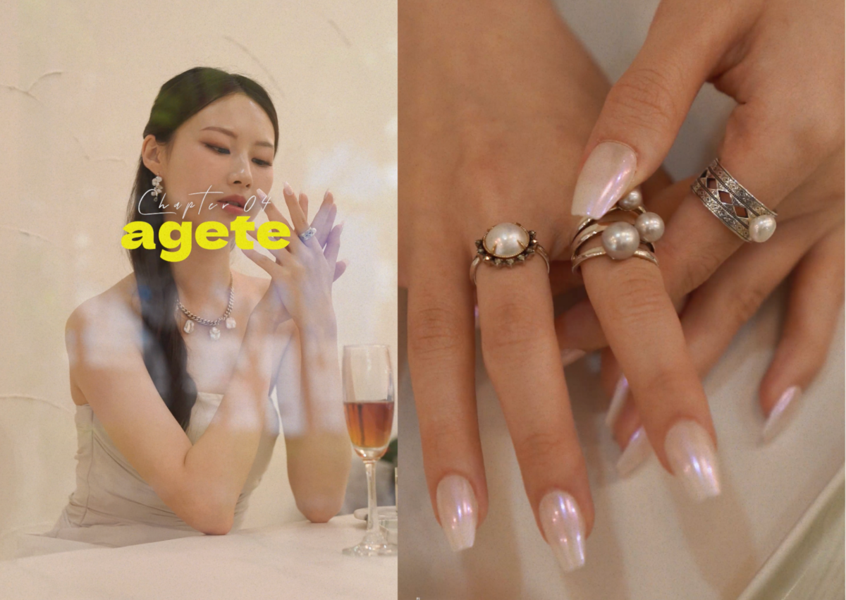 1990年誕生於東京青山的日系珠寶品牌 agete,傳遞以細膩質感讓商品融入生活的概念,融入異國古董家具與暈黃燈光的陳設,營造出溫暖氛圍。這次選擇的珍珠單品都帶有強烈復古意味,像是不規則珍珠耳環和項鍊,皆以黃 K 金材質與 Akoya 珍珠搭配而成,手上的戒指也充滿復古氛圍。
