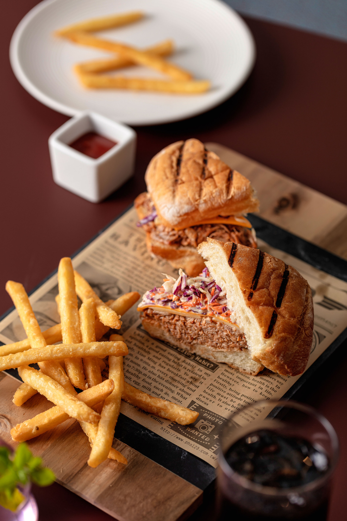 古巴三明治源起於美國佛羅里達州,古巴裔工人的午餐,拜電影《五星主廚快餐車》之賜,成為席捲全球的人氣輕食。「板石咖啡廳」不但點得到,風味還特別有記憶點。主廚強調,煙燻豬梅花肉一定要耐心拆成細絲,才能均勻拌進烤肉汁、美乃滋與BBQ醬調味,以凸顯其潤澤酸甜的口感。用ciabattini麵包夾起手撕豬肉、高麗菜沙拉與艾曼達、切達兩種起司熱壓,製造出外酥內軟的口感、麵包和餡料互相融合,每一口都是讓人吮指回味的感動。