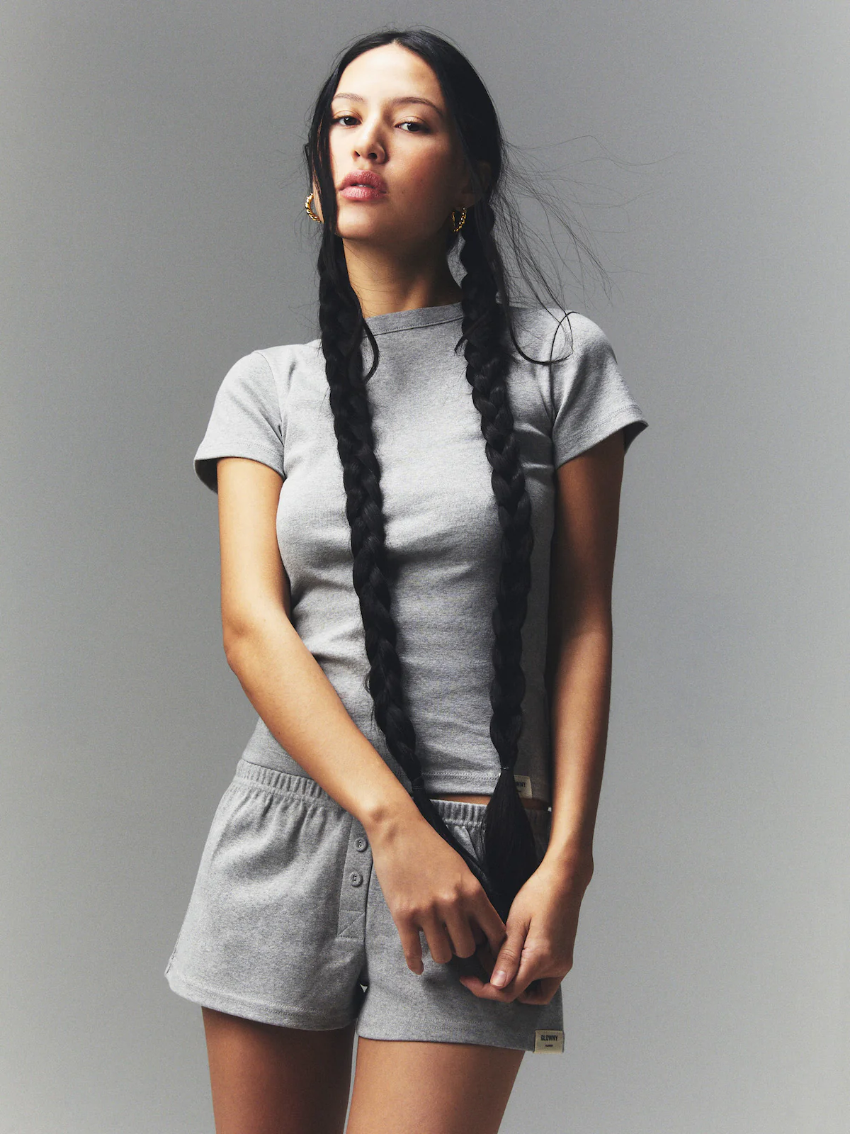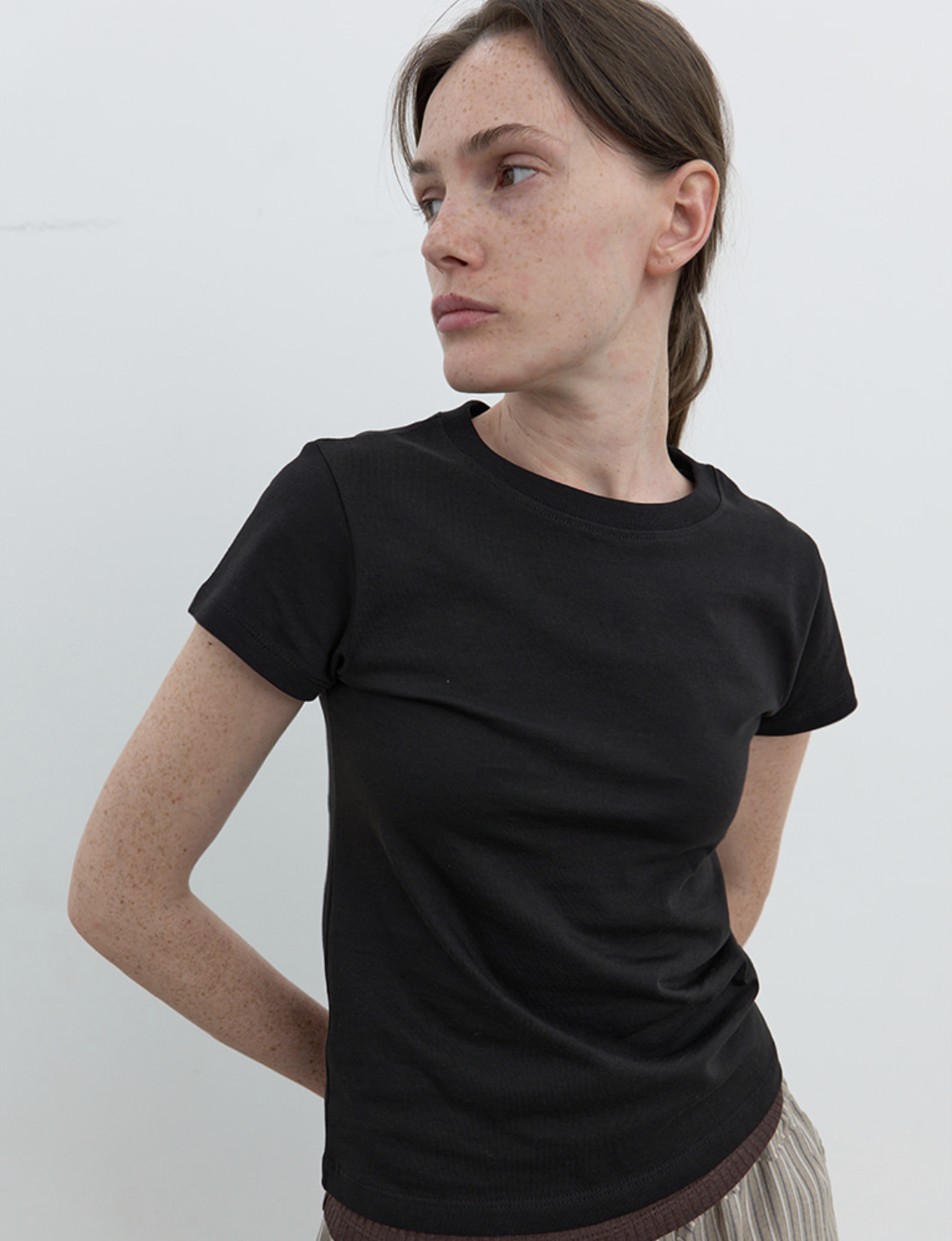 如果偏好合身剪裁與厚實質感,瑟琪私心推薦GLOWNY這款短版素T,領口滾邊紮實有型,不易鬆垮,整體穿起來挺拔俐落,共推出五種版型選擇,左下角還巧妙縫上品牌標籤,低調中帶點設計感。