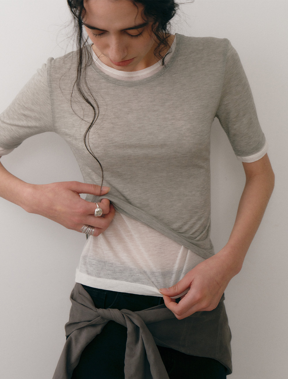 來自韓國設計師品牌 Low Tide 的這款五分袖上衣,以灰白雙層拼接設計打造出層次感十足的視覺效果,雖然是雙層結構,但整體選用輕薄透氣的材質,非常適合喜歡疊穿風格又重視穿著舒適度的各位入手。