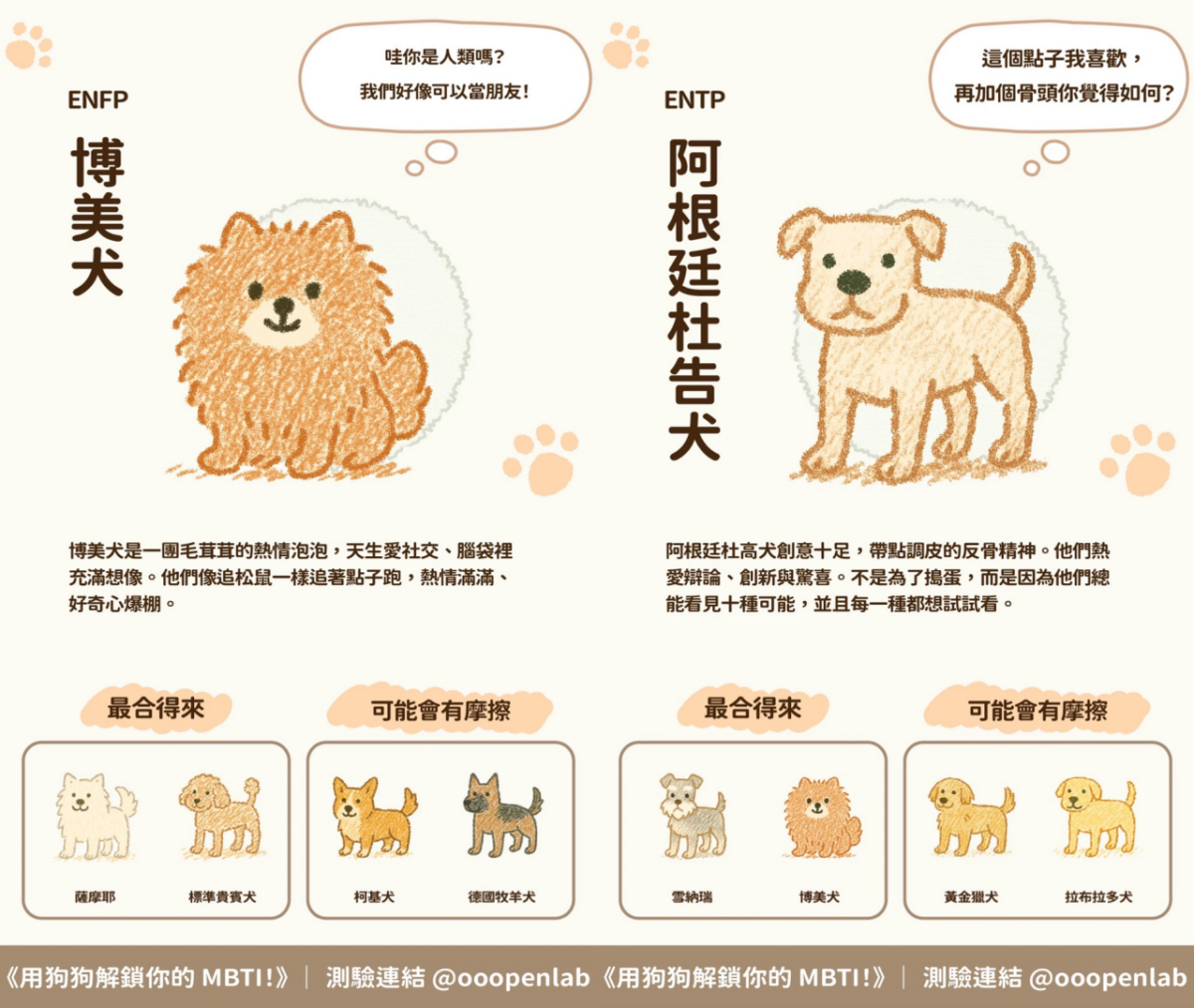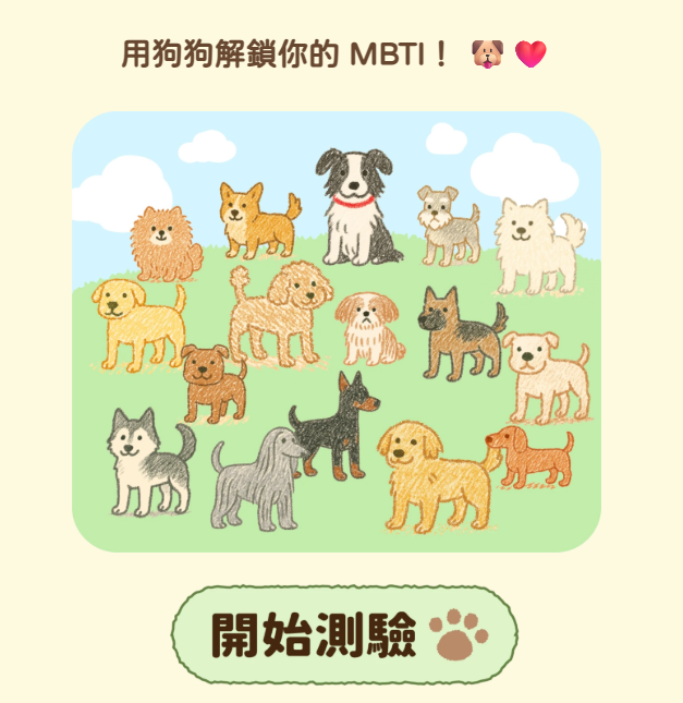 你是否有好奇過,如果您的MBTI人格類型化身為一隻可愛的狗狗,牠會是什麼模樣呢?最近就有一款「用狗狗解鎖你的MBTI」心理測驗開始在社群流行,這款心測驗將MBTI 16型人格與不同犬種的獨特個性巧妙結合,趕快來測測看一起從「汪星人」視角,發現自己與眾不同的性格魅力吧!