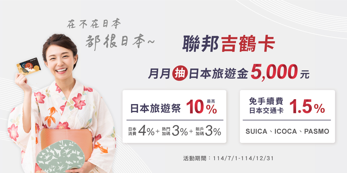 想讓旅費再升級?現在只要持「聯邦吉鶴卡」於國內當月消費累積滿10,000元,就能獲得一次抽獎機會!每月抽出2名幸運兒~直接獲得「日本旅遊金 5,000 元刷卡金」!中獎名額每月都會公布,活動一路延續到今年底,錯過這波真的會FOMO~