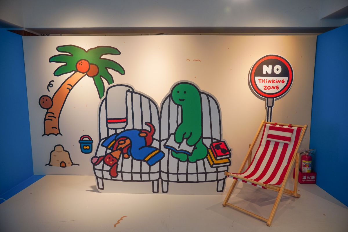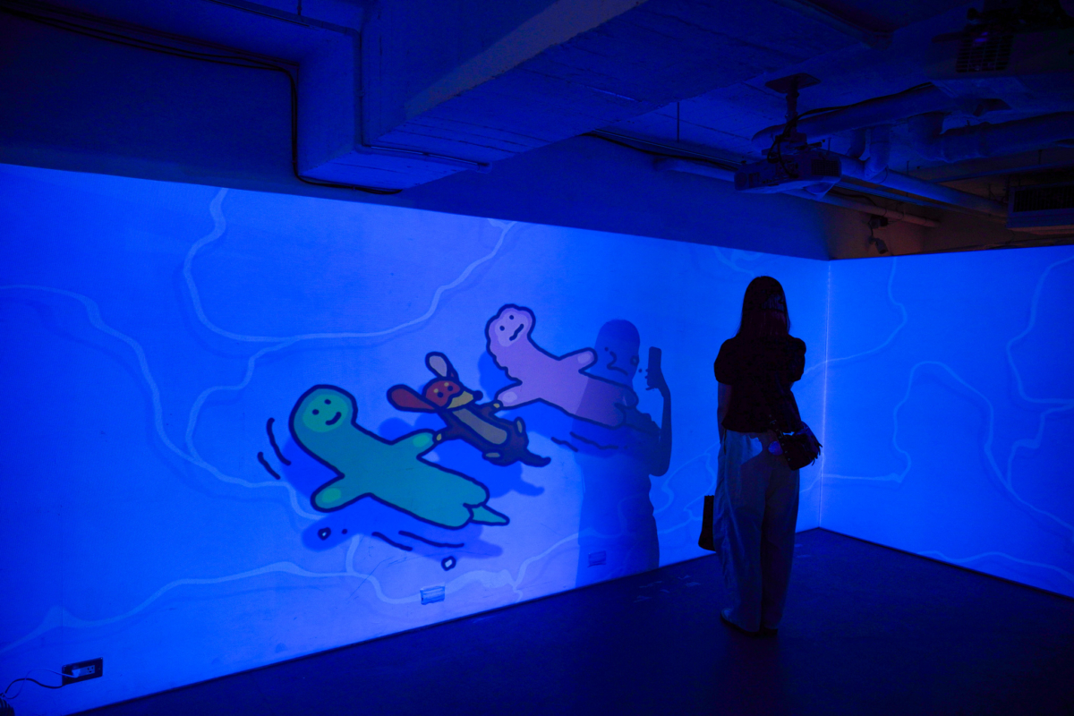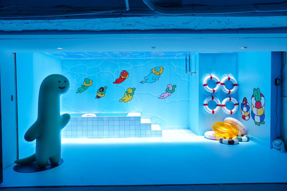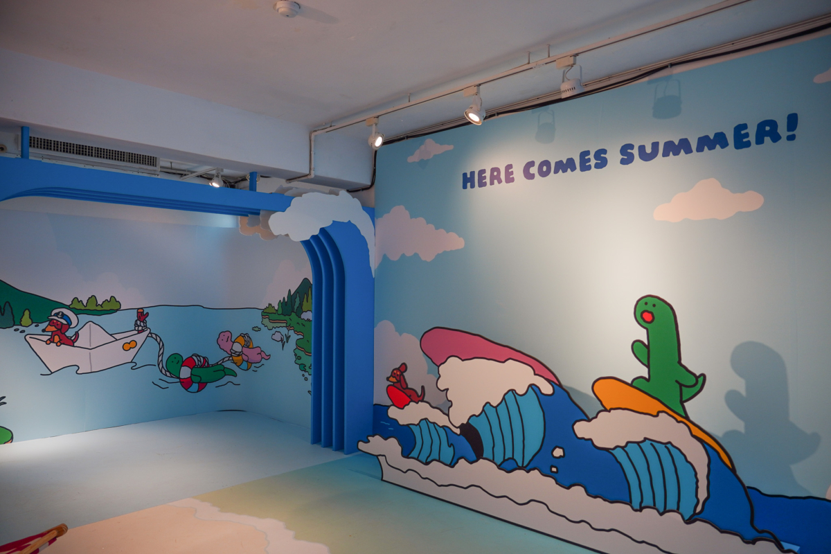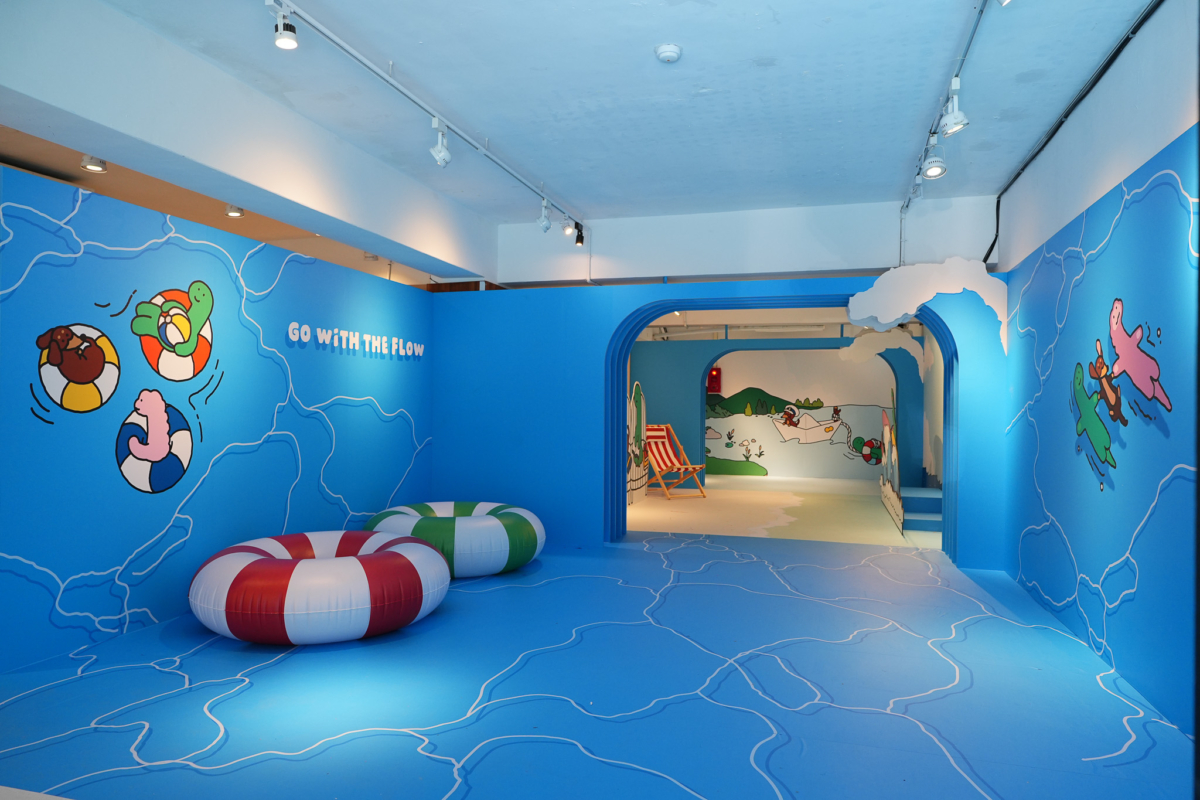本次展覽以「GO WITH THE FLOW」為主題,邀請大家進入JOGUMAN的奇幻水世界。從入口就能看見BRACHIO、DIPLO與臘腸狗WOODY溫暖迎接,彷彿一同踏上夏日漂流之旅。