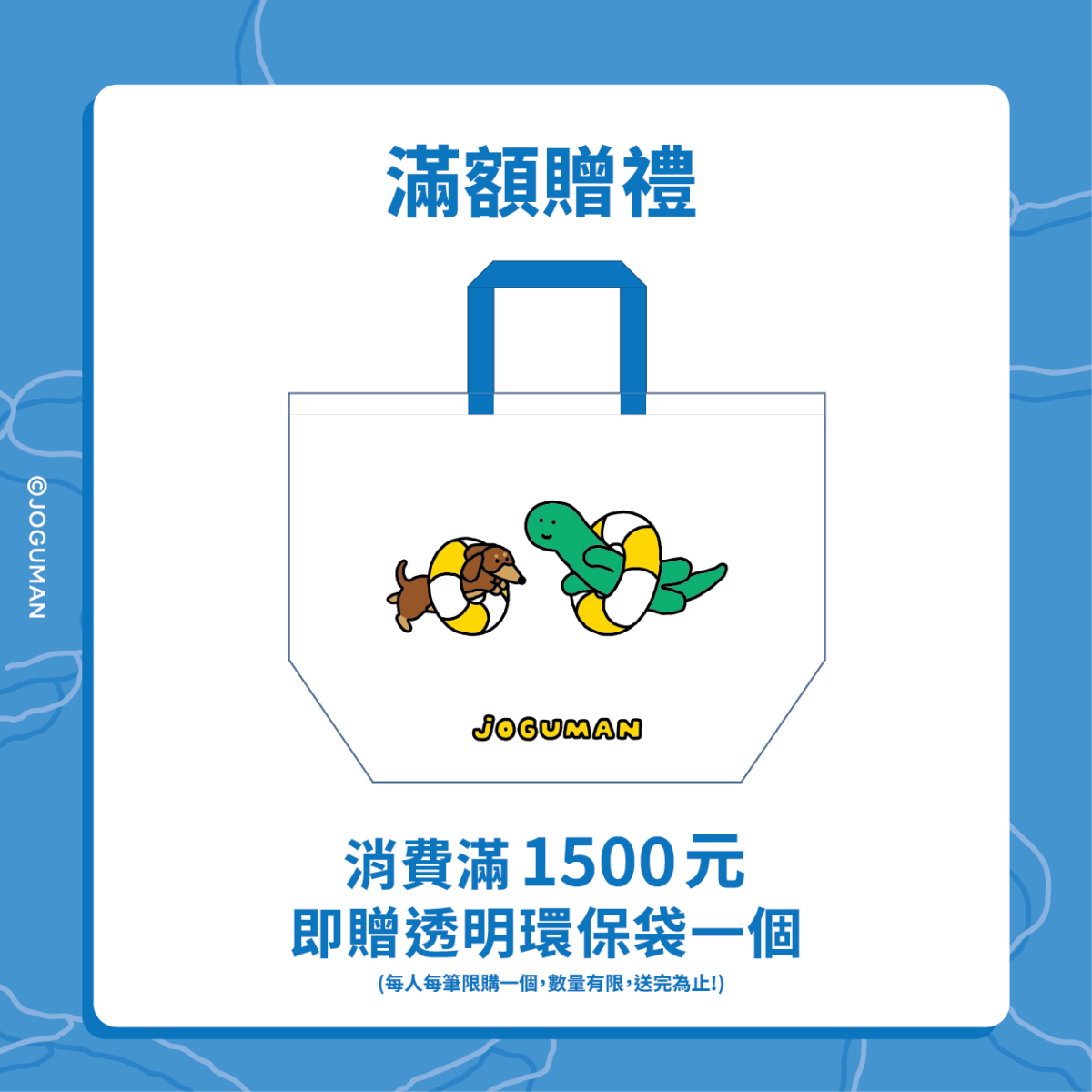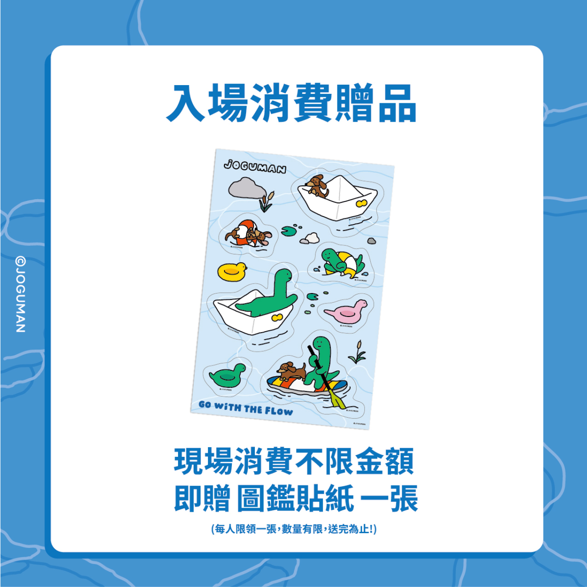 凡於展覽期間不限金額消費,即可獲得「JOGUMAN主題圖鑑貼紙」乙張;單筆消費滿1,500元,更可獲得「JOGUMAN透明環保袋」一個,數量有限送完為止。此外,只要消費即可用90元加購原價120元的「JOGUMAN主題明信片」,無論收藏或寄給好友都是夏日最佳紀念,快相約好姊妹一起來JOGUMAN夏日漂流主題展療癒清涼一下吧!
