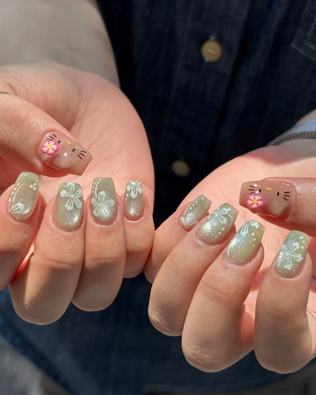 原本僅限於夏威夷、沖繩販售的「日燒Kitty」,近期因與多個品牌聯名合作而爆紅,這款曬成小麥色肌膚的Kitty,不僅吸睛度滿分,也展現出與眾不同的創意感,轉化為美甲設計時,更為整體造型注入滿滿夏日氣息,再搭配朱槿花點綴,視覺上更添度假風情。