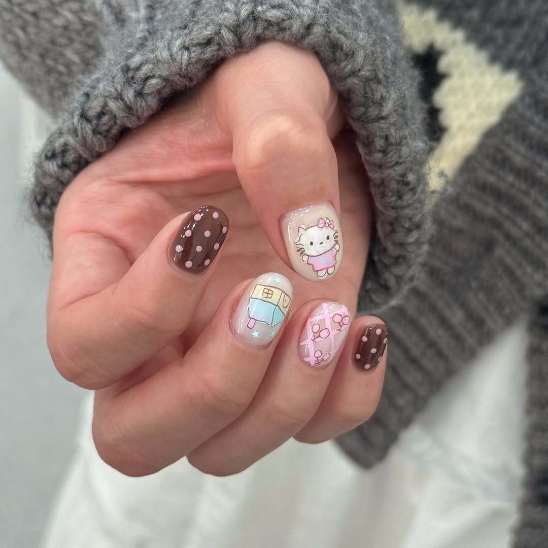 喜歡手繪感美甲的你,不妨試試這款柔和的Kitty畫風,先以色塊勾勒出基本外型,再用色鉛筆層層疊加,描繪出細緻輪廓與裝飾細節,不只更有手繪筆觸的質感,整體色彩也偏向簡約低調,即使與其他圖案搭配也不會顯得突兀,反而更能展現出溫柔協調的美感。