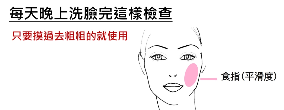 除了特殊場合、生活型態突然變更…等時刻之外,其實每天晚上都用心聆聽肌膚的需求。只要做完清潔後,用食指滑過較容易乾燥的臉頰,觸感粗粗的時候就可以+1!