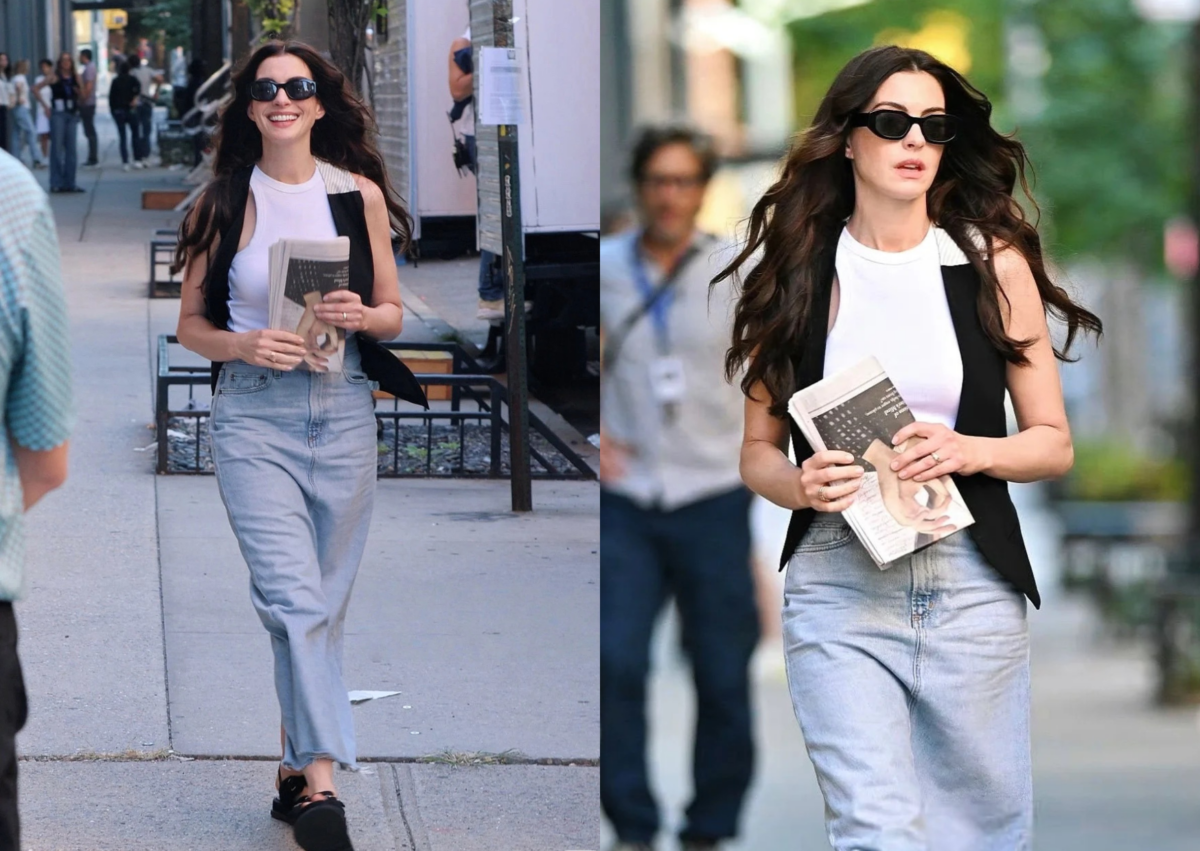白色搭牛仔永遠是衣櫥裡最百搭又時髦的搭配,安海瑟薇身穿 Toteme 白色挖肩背心配上 Agolde 淺色牛仔裙,看似簡單卻很俐落時髦的造型,搭配她代言的 Versace 墨鏡、腳踩 Chanel 涼鞋,整身的設計感非常強烈,可以發現比起二十年前的劇中的造型,顯得更專業俐落了些,編輯已經開始期待之後造型穿搭了。