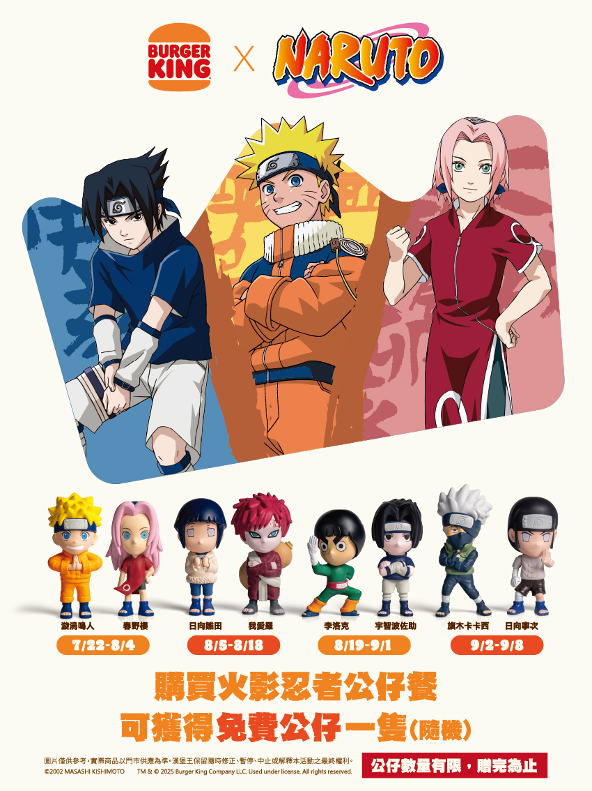 火影迷必吃!漢堡王聯名《火影忍者》推出限量火影套餐,7月22日全台開賣,鳴人、小櫻、佐助公仔必收集