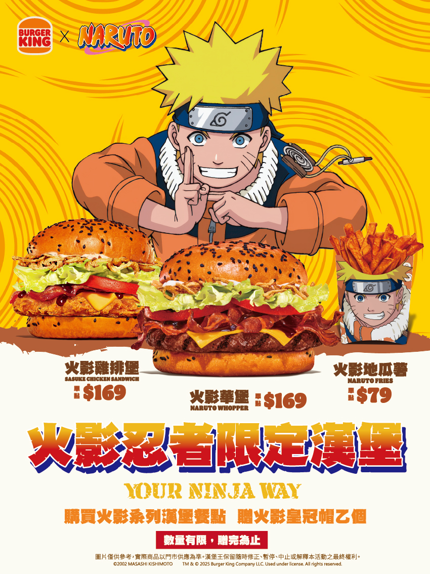漢堡王與人氣動漫《火影忍者》聯名!7月22日起至9月8日限時推出「火影公仔餐」系列活動,不但推出火影華堡、火影雞排堡及火影地瓜薯3款聯名美食,只要到漢堡王門市臨購買火影公仔餐,就可以得到人氣角色隨機公仔,火影迷直接瘋掉啦~