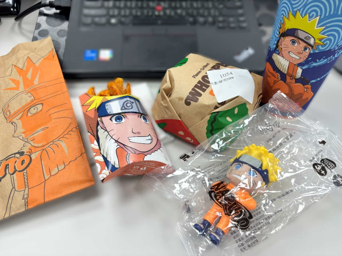 這次聯名推出火影華堡和火影雞排堡都是新登場的聯名口味,外觀主打橘色麵包呼應鳴人的代表色,吃起來也比原本的漢堡更有層次。火影華堡用的是火烤牛肉,再加上照燒醬、炸洋蔥、培根和雙起士片,鹹香濃郁;火影雞排堡則是用超大塊的厚實雞腿排,同樣加上照燒醬、番茄、生菜、炸洋蔥和起士片,一口咬下去去卡滋卡滋的超脆雞肉超級滿足!還有這款在社群引起討論的「火影地瓜薯」!選用台農66號地瓜炸成,外酥內綿,裝在鳴人造型的專屬紙盒裡看起來相當有趣XD
