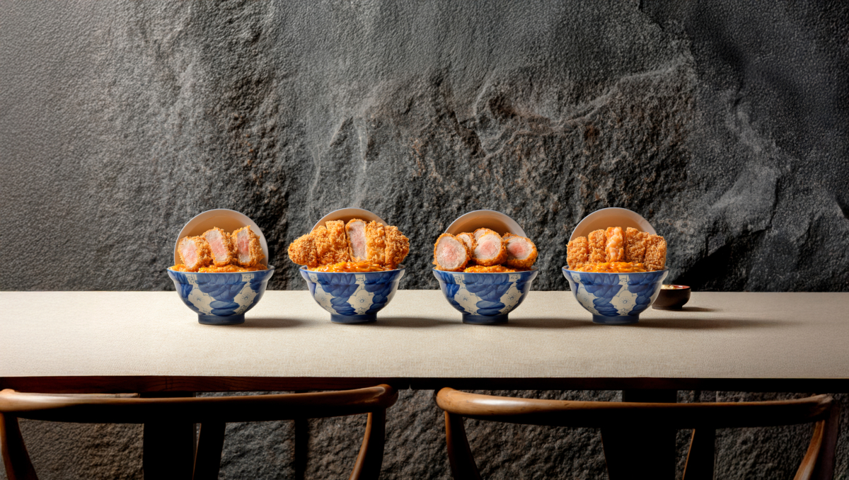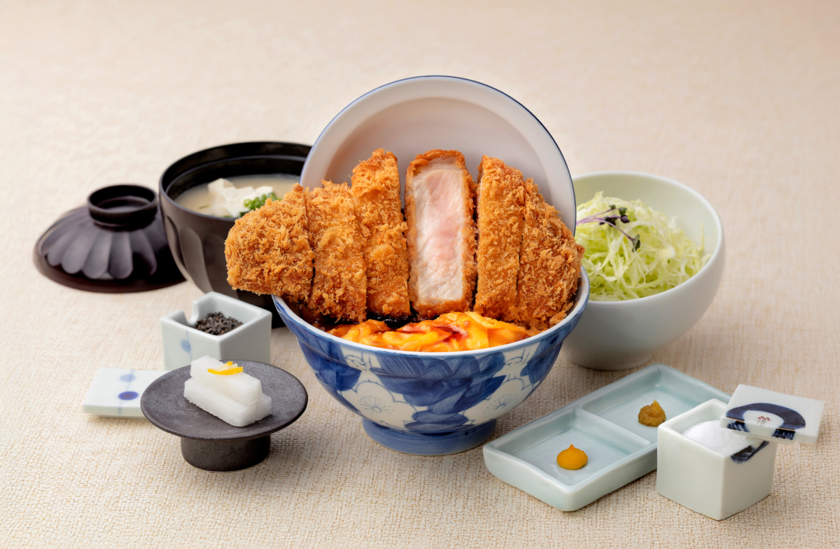 擺盤採用日本精緻彩釉蓋碗,碗蓋立起時呈現如舞台劇般3D象限的類「劇場式」空間:底層香Q米飯,中層滑蛋,頂層則是大到超出碗口的厚切豬排。搭日本原汁原味的秘製醬汁注入蛋與飯之間,一口咬下多層次交織的美味,創造出視覺與味道同步升級的新食感豬排丼。