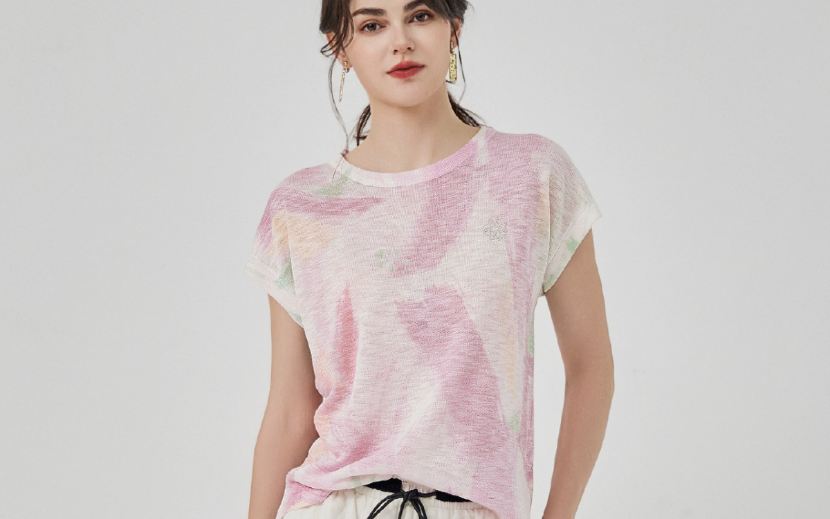 運用植物蠶絲與聚酯纖維的黃金混紡比例,呈現天然涼感與耐穿性。以漸層暈染手繪設計搭配雲彩織法,打造絲霧感視覺,再結合拼花定位套印工藝,讓每一件上衣都宛如藝術品般獨一無二。布料輕盈、觸感柔滑,穿著冰沁不悶熱,日常也能穿出自在高雅。